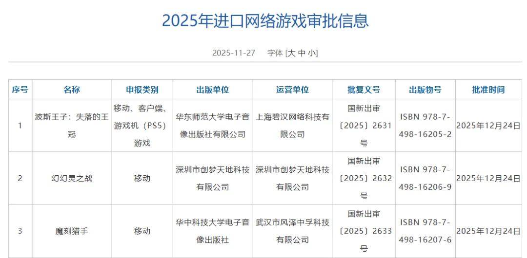 2025年12月国产游戏版号列表如下: