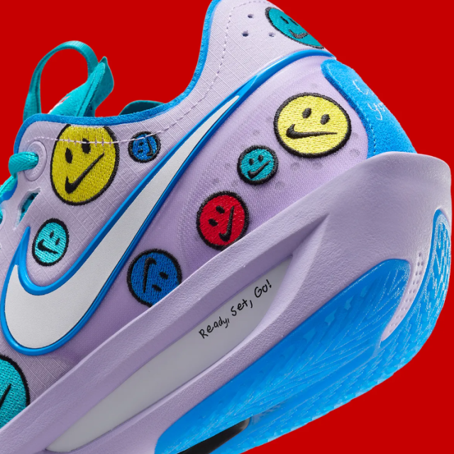 最特别的当属鞋面位置缝致的各种色彩“歪嘴”笑脸图案,每一个Have A Nike Day!的笑脸嘴巴位置都是Nike的Swoosh Logo;此外,鞋履的左右两边后跟分别有手写样式的“Got you!” 和 “Go be great!”,最后“Ready,Set,Go!”的字样出现在鞋履中底,彰显其独特设计感。