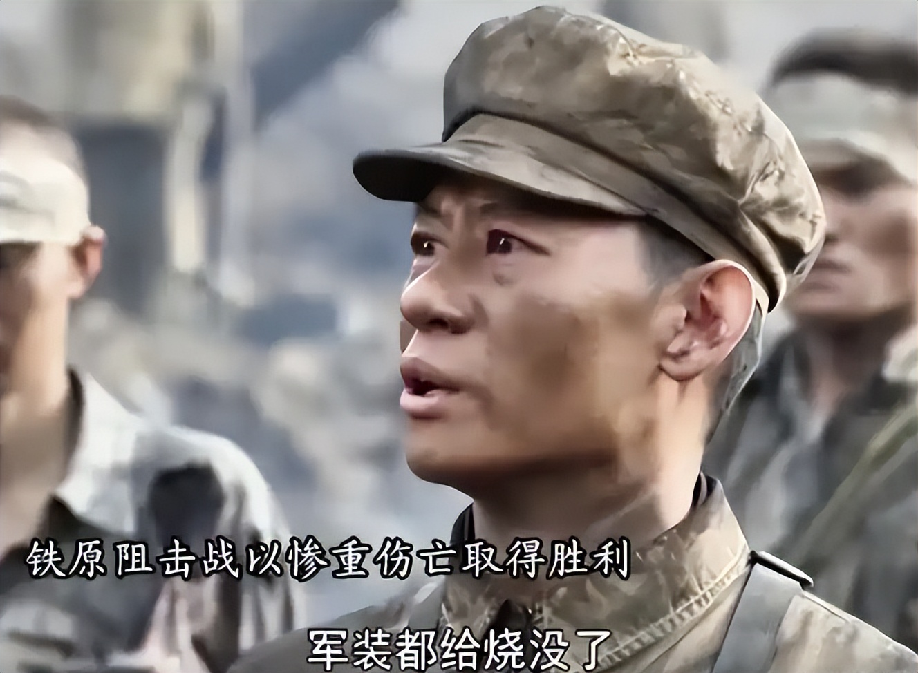 脸上全是硝烟,两只手布满了裂口和水泡,那是在工事里、在炮火里十几天留下的痕迹。整个人站在那里,还是军人的姿态,可眼圈是红的。