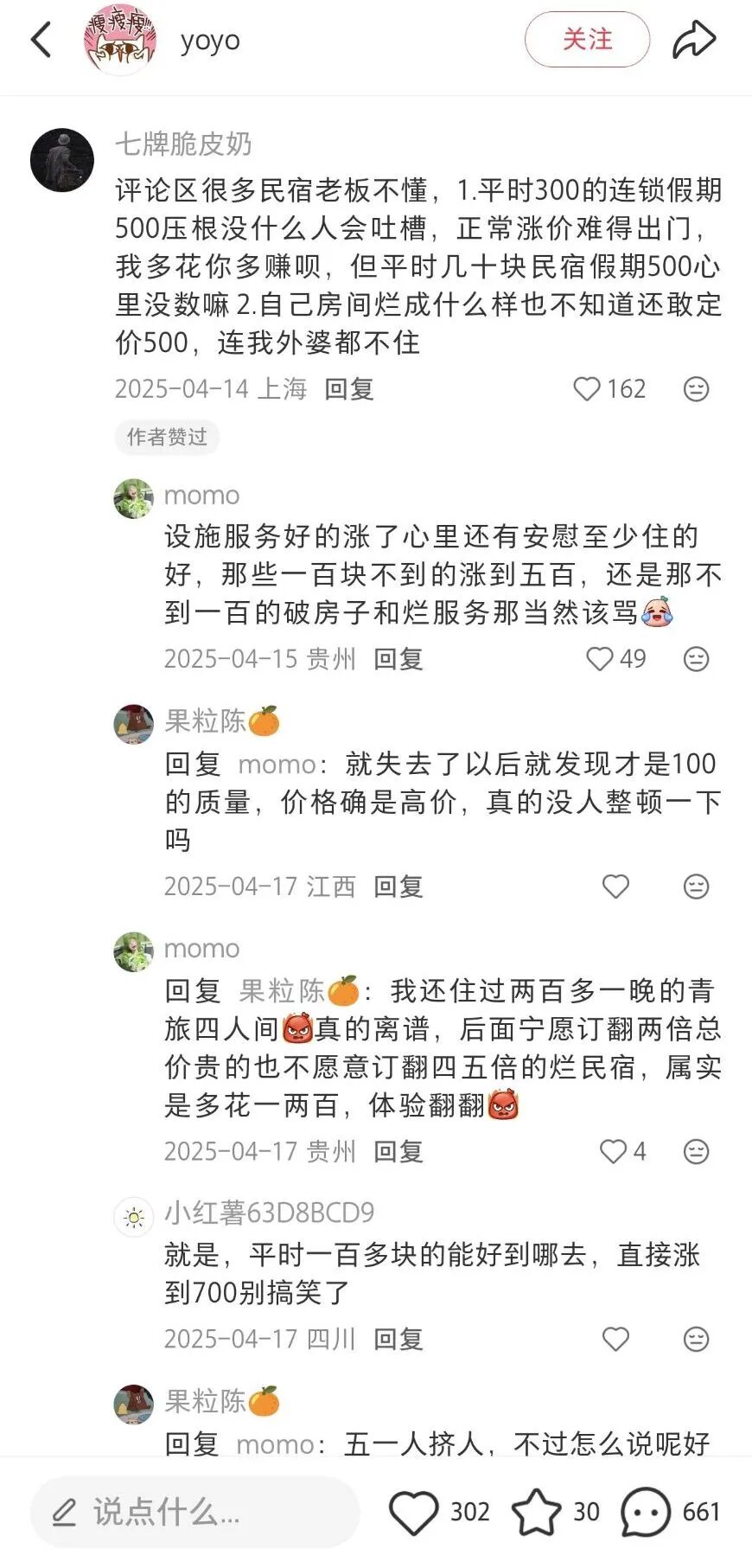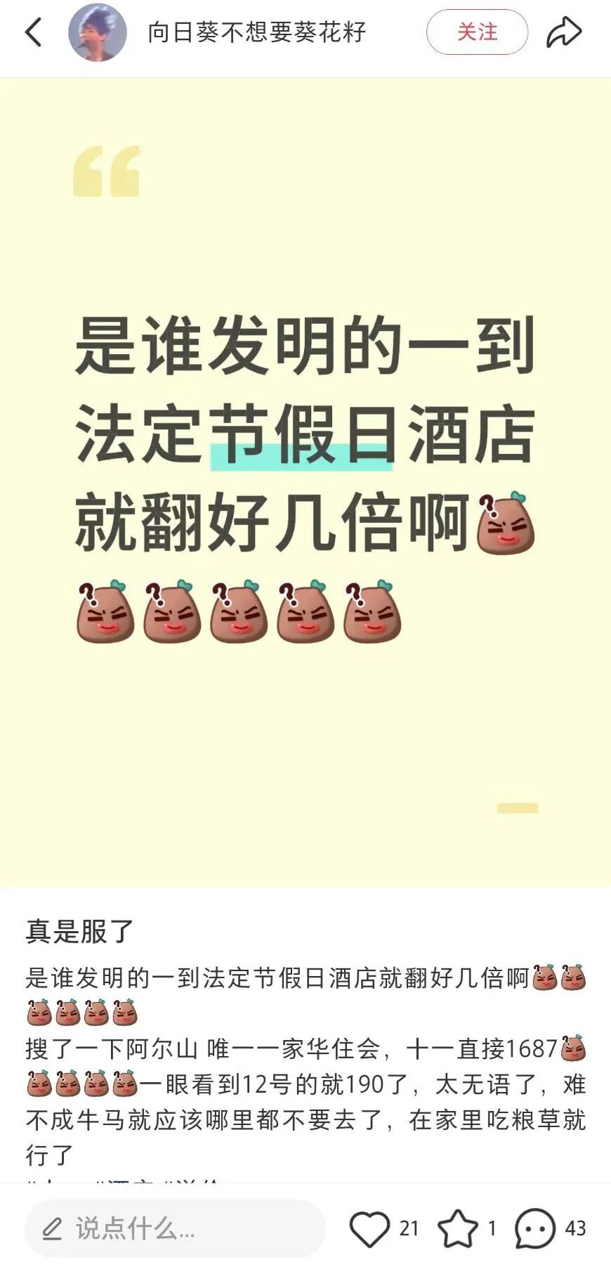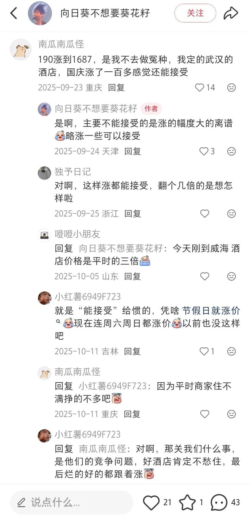 【图源小红书|面对节假日酒店严重溢价,有消费者直言:“市场经济,无可奈何啊”、“久而久之也都默许了这种行为”】