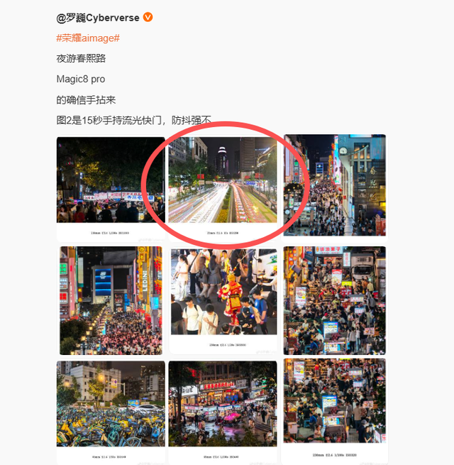 10月3日罗巍发布了多张荣耀Magic8 Pro拍摄的夜景照片,并且重点介绍了15秒手持流光快门,试图展示这款手机的防抖能力。