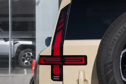 大灯的设计更是暗藏巧思,其造型灵感源自古代兵器 “戈”,凌厉的线条中蕴含着 “止戈为武” 的东方哲学,既展现了硬派越野的强悍特质,又传递出对和平探索的追求。而日行灯内部的菱形花纹,取材于国宝 “越王勾践剑”,将历史文化图腾融入现代工业设计,让这款充满机械感的车型多了一份文化底蕴,在众多 “方盒子” 造型的硬派 SUV 中显得格外独特。