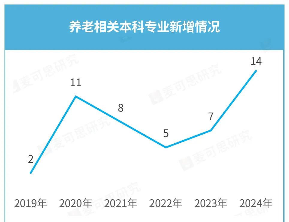 近年来,全国本科高校申请新增养老服务管理、老年医学与健康专业的数量增长:2019年仅2所,2020年增至11所,2021年8所,2022年5所,2023年7所,2024年达到14所,总计47所。这一数据反映出高校对养老人才培养的日益重视。