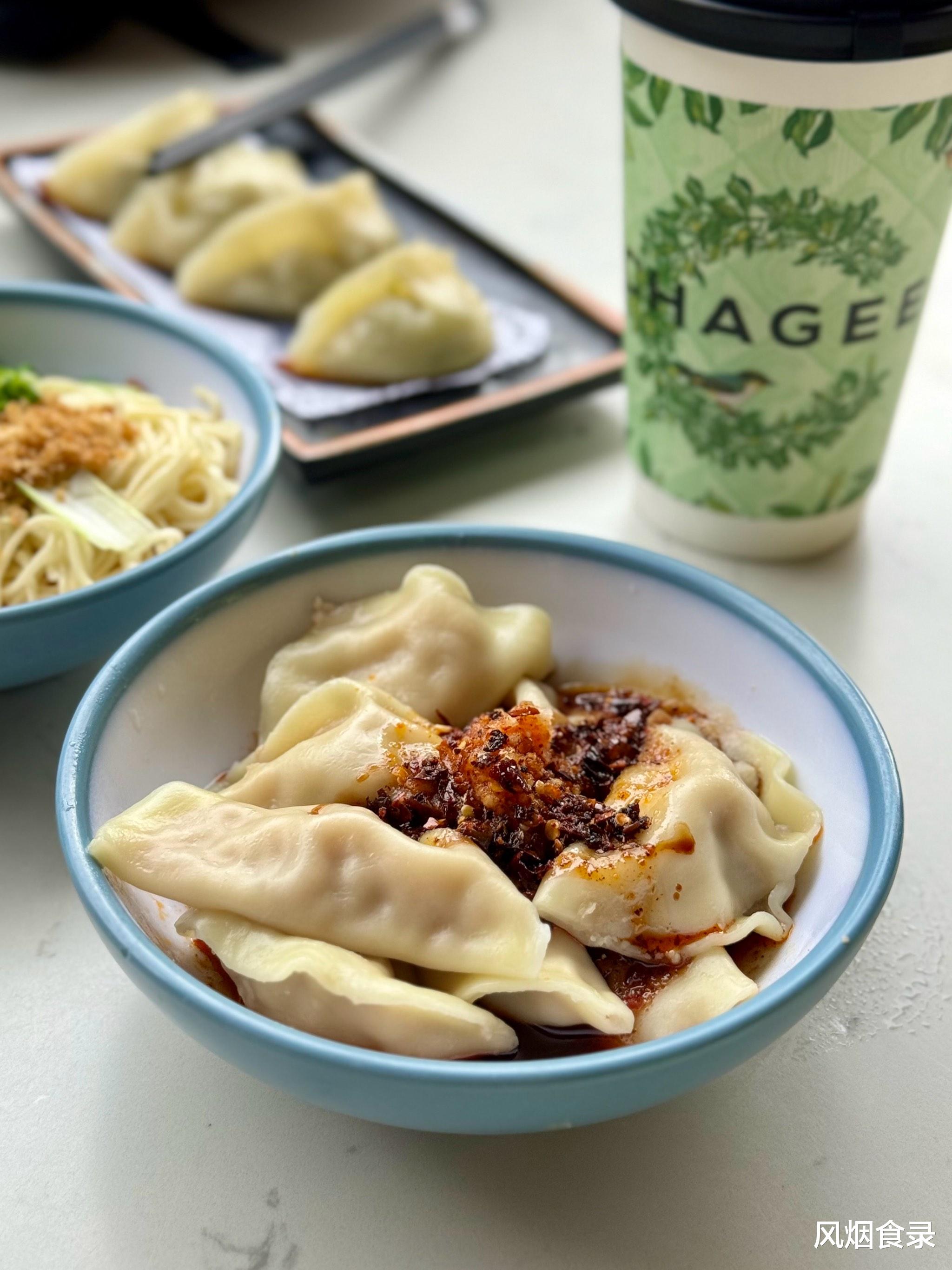 饺子煮到浮起就捞,淋上红油汁,配碗热饺子汤,