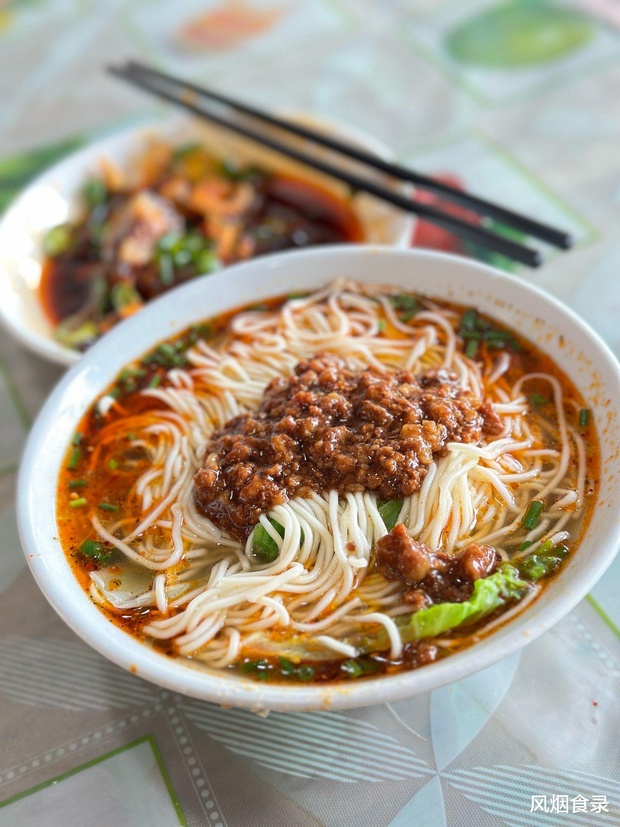 手擀面煮熟,浇上炒得喷香的肉末,撒把葱花芽菜,淋点红油,最后来勺陈年老醋,