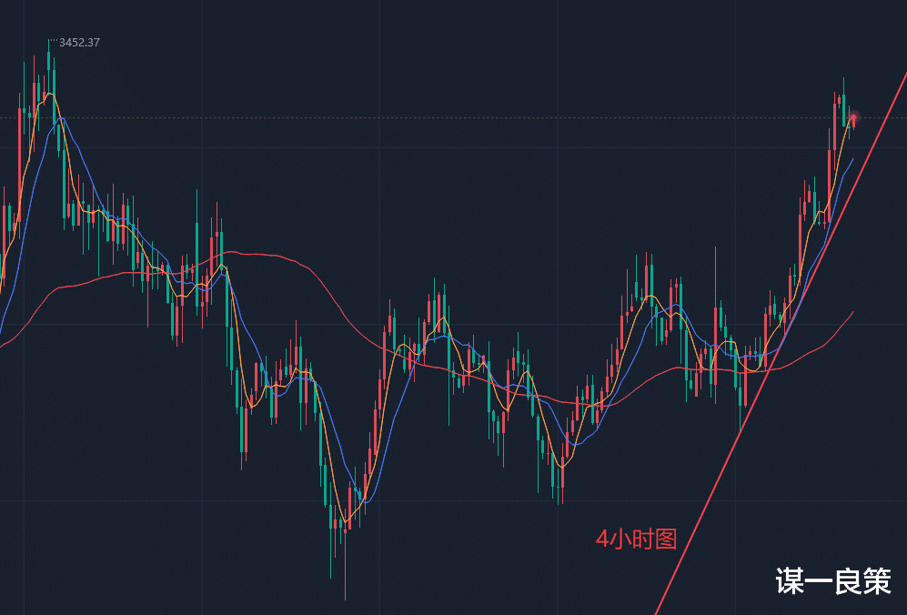 技术面上,本周金价连续站上3450和3400的关口上行,下一步的的主要压制点在前期多次触及回踩的位置3350附近,另外,周一上升的高点3400一线,与周二回踩的低点3405附近,形成了新一轮的顶底转换的区域,所以当下这里这是重点关注的支撑。并且小周期震荡上行的低位趋势线也是在这个位置。如果本次上升能够站稳在3450之上,那么历史高点大概率可能被刷新。反之,不排除无法脱离日线级别宽幅震荡的可能性。
