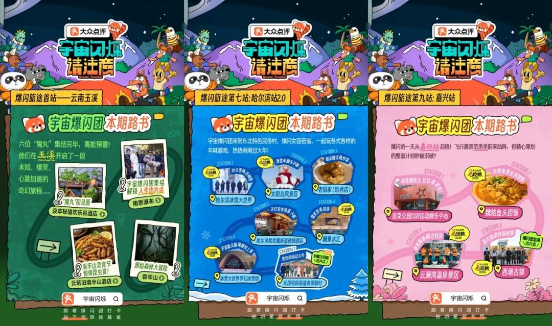 在《宇宙闪烁请注意》中,大众点评也实现了对旅行场景的深度融入,嘉宾会根据大众点评任务探索城市,去网友推荐的餐馆吃饭,去必玩榜上的地点打卡。大众点评在站内同步上线了“跟着爆闪团去打卡”活动页面,详细展示节目同款旅游路线,让观众可以轻松实现“线下打卡同款”的心愿。