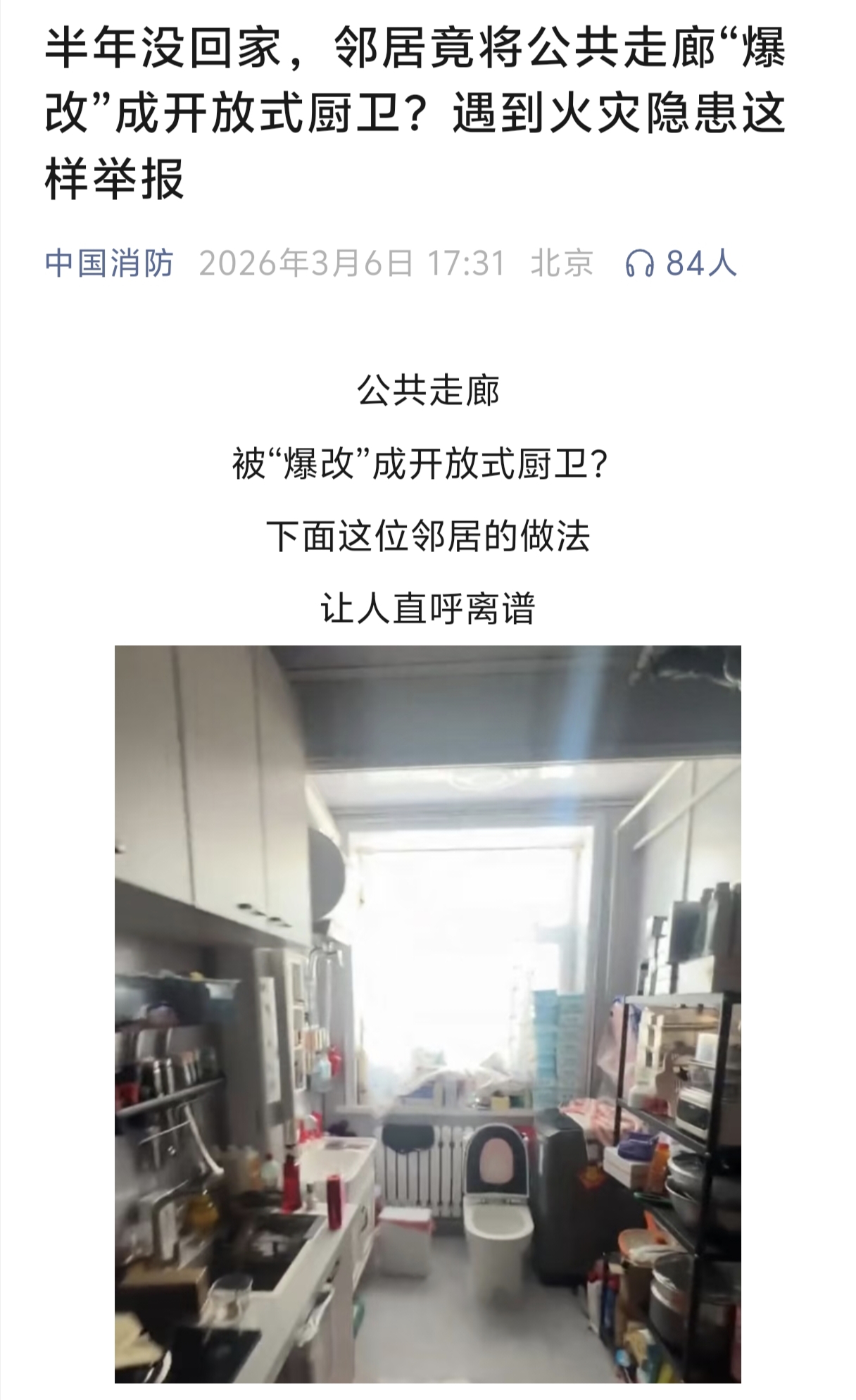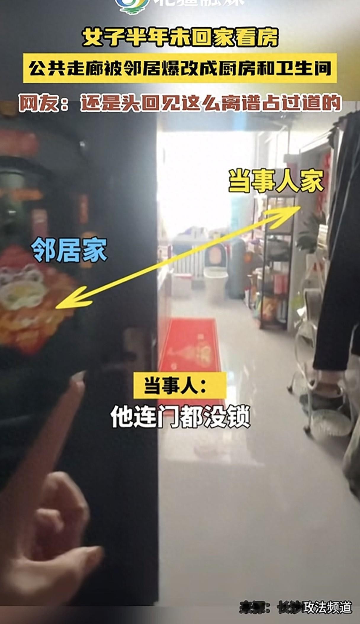 3月5日,一女子半年没回公寓了,年后抽空回去看看,才发现门口的公共走廊竟被邻居装成了厨房和卫生间,连自己家的门框都被包了边。