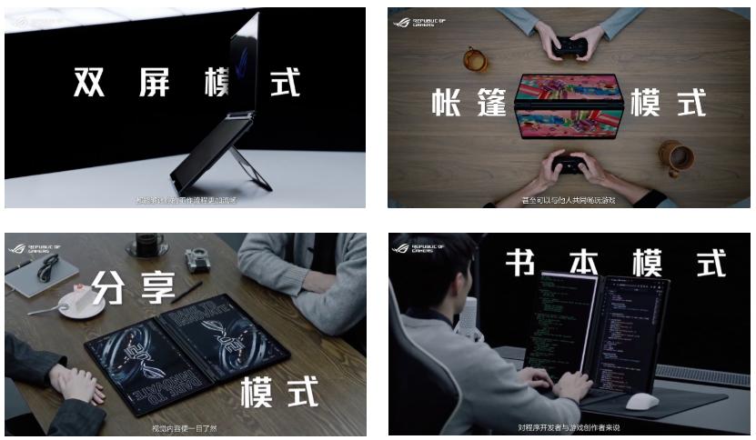 ROG 幻16 双屏支持90°开合支架与320°翻转转轴设计,用户能够变化多种形态来应对不同的使用场景。比如在游戏时,用户可以可以开启双屏模式,主屏用来显示游戏画面,副屏能够实时显示状态与各类信息,比如成就、出装状态、技能点等;也可以开启帐篷模式与朋友共同畅玩游戏;而在进行创作工作时,开启分享模式,主副屏显示同样的素材向对方展示,进行程序开发时开启书本模式,效率更高!