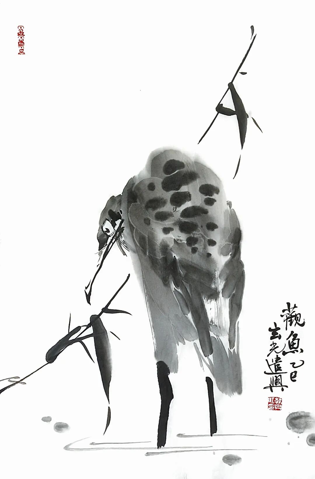 观其笔墨,可见技法的娴熟与情感的交融。线条时而以中锋勾勒,如竹枝挺拔、花茎柔韧,尽显骨力;时而以侧锋皴擦,在芭蕉叶、芦苇丛中营造出墨色的浓淡干湿变化,层次丰富。墨色的运用尤见巧思:浓墨点苔、焦墨写竹,淡墨晕染花瓣与禽鸟绒毛,干湿互衬间,画面既有淋漓的元气,又不失清雅的格调。