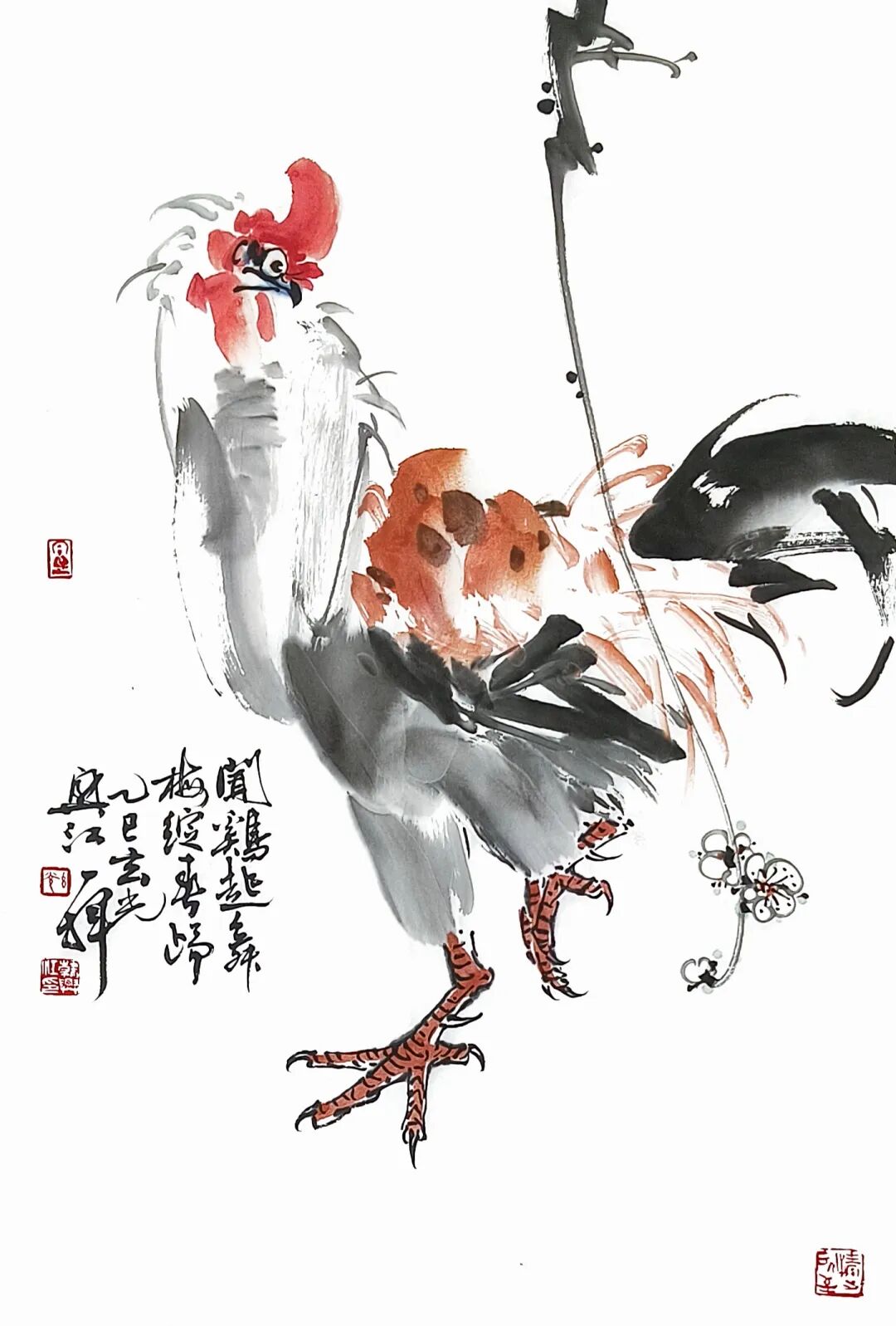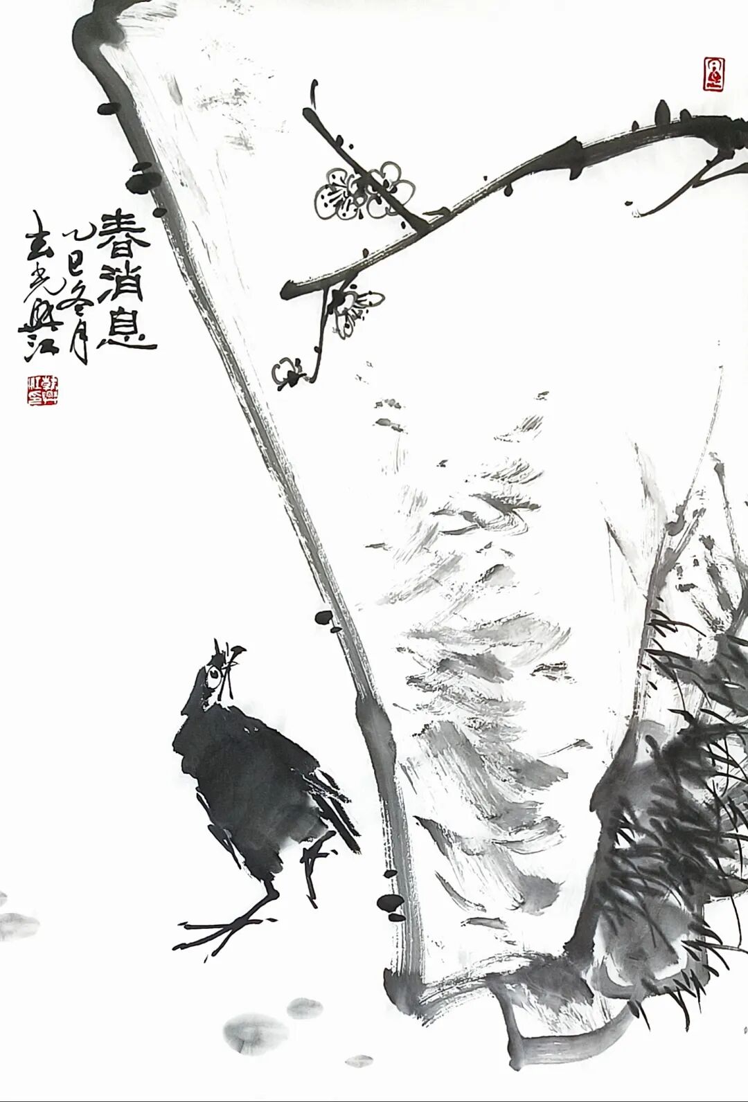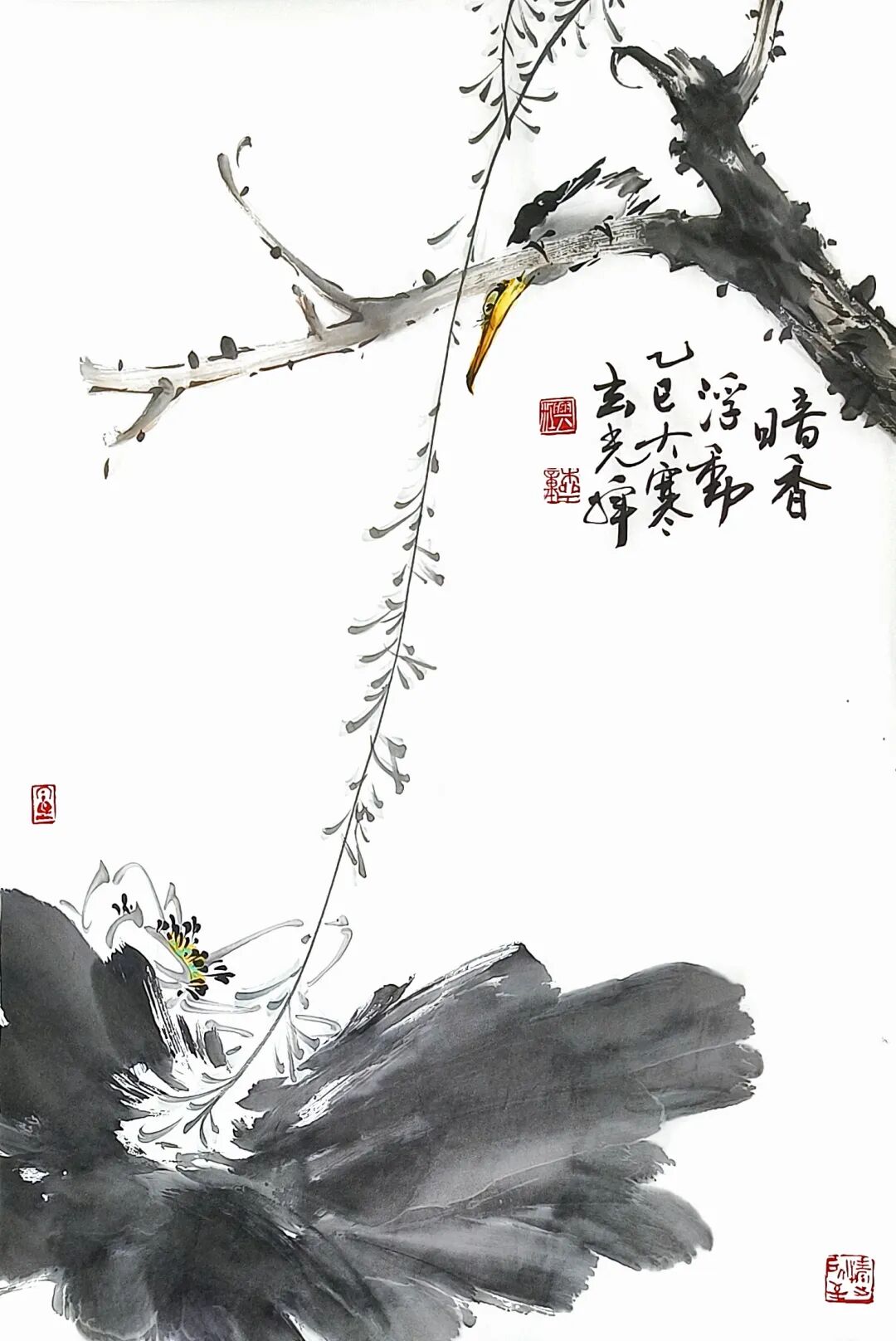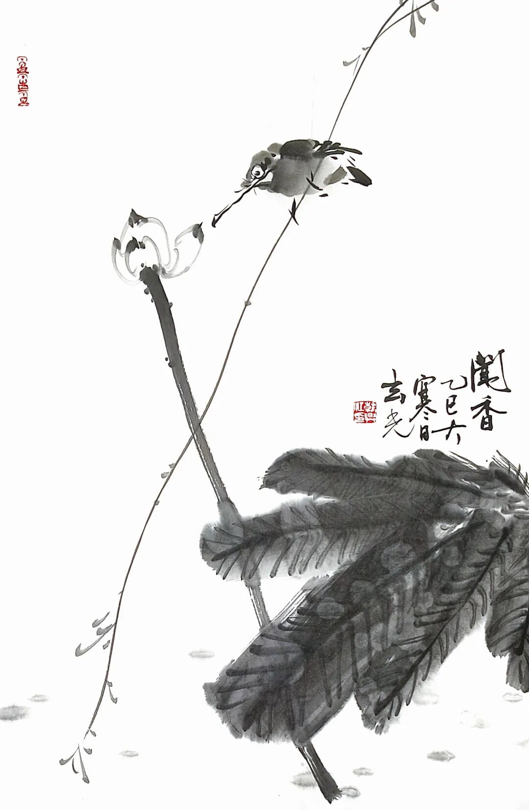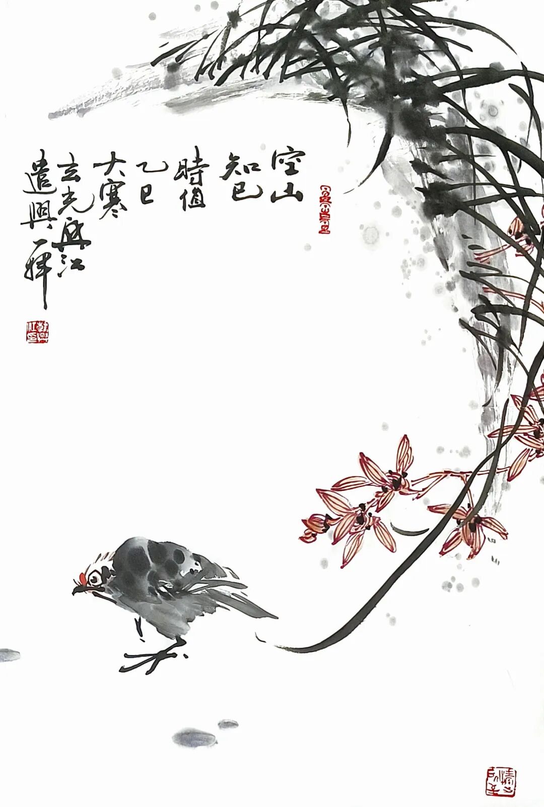 写意花鸟的精髓,在于以笔墨为骨、以意趣为魂,在尺幅之间承载文人的精神世界。韩兴江这批花鸟小品,正是这一理念的鲜活注脚。画作以“三境(静、净、敬)”为底色,将自然草木与禽鸟的灵动,转化为充满生命力的笔墨语言。