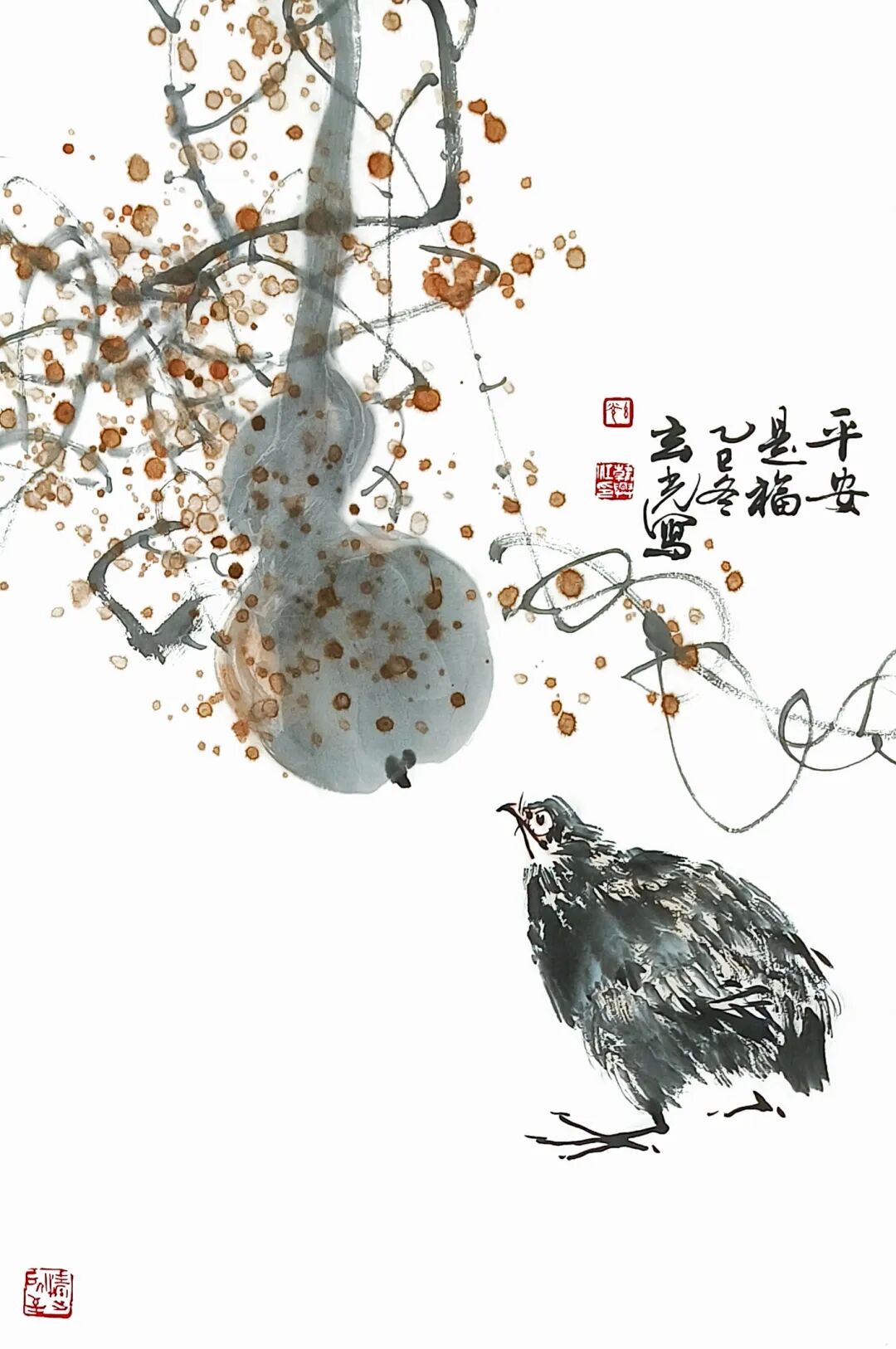 更难得的是,这批小品兼具文人意趣与生活温度。题款中的“平安是福”“暗香”等文字,与画面相映成趣,将笔墨美感与精神寄托融为一体。韩兴江以“静”观照物象,以“净”打磨笔墨,以“敬”对待创作,让观者在尺幅之间,既能感受到传统写意的文脉传承,也能触摸到当代创作者的鲜活心跳。