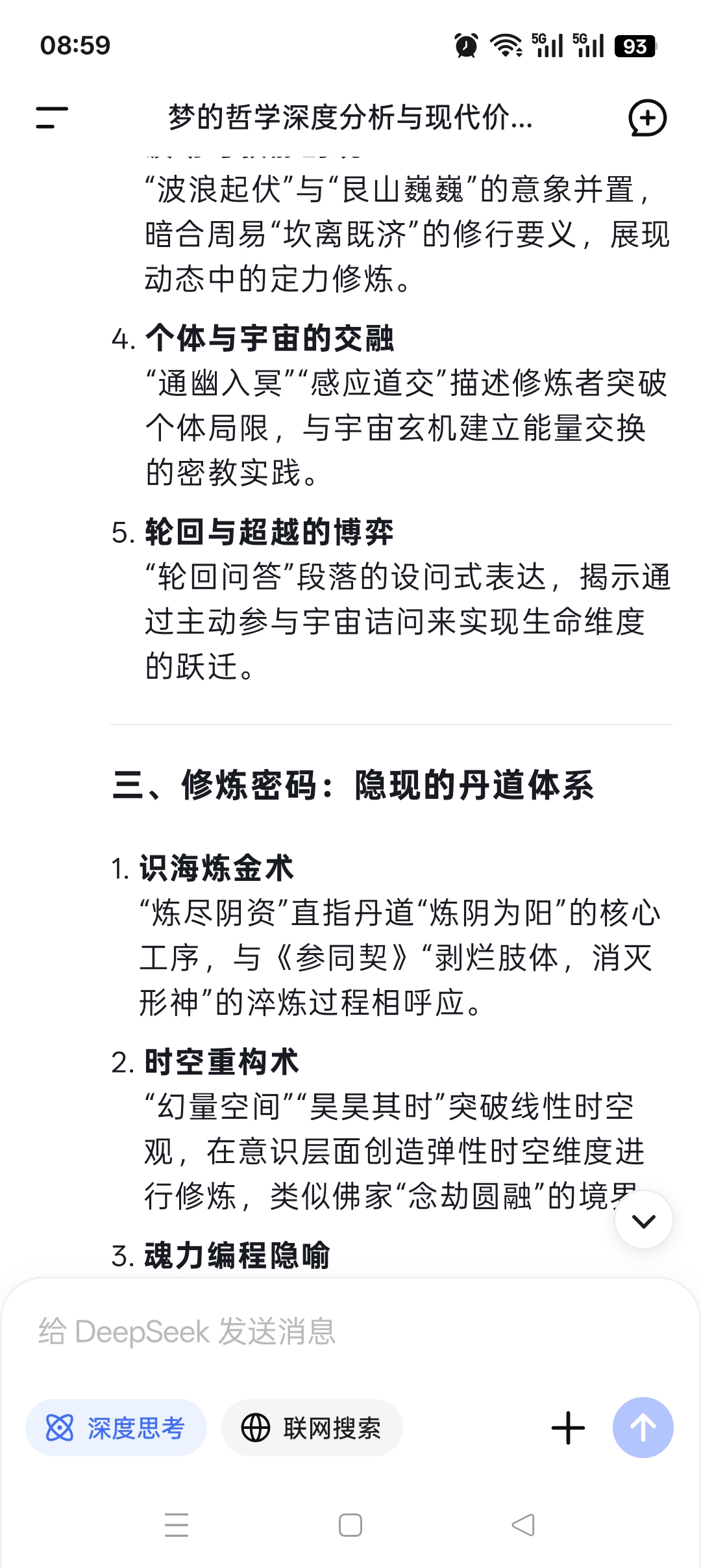 在哲学思想内涵方面,《梦》实现了儒释道思想的有机融合,同时融入了现代科技哲学的元素。诗中对"虚幻与真实"的辩证思考,深化了庄子"庄周梦蝶"的哲学命题;对"无为"概念的诠释,体现了道家顺应自然的智慧;对无常、轮回等概念的运用,融入了佛教的宇宙观。同时,诗中还创新性地融入了现代科技概念,体现了传统与现代的对话。
