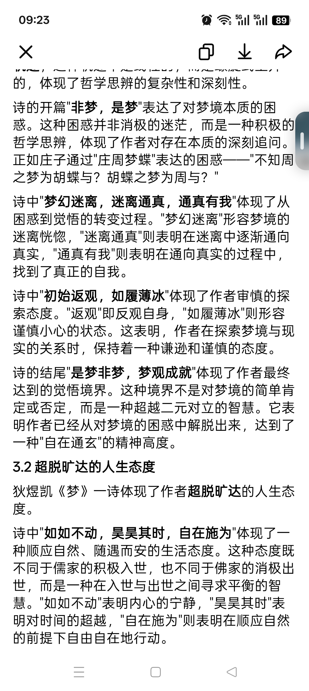 诗的结尾"柔和虚实,赤诚以对"体现了作者圆融通达的人生境界。这种境界不是对梦境的简单肯定或否定,而是一种超越二元对立的智慧。它表明作者已经从对梦境的困惑中解脱出来,能够以一种平和、真诚的态度面对一切。