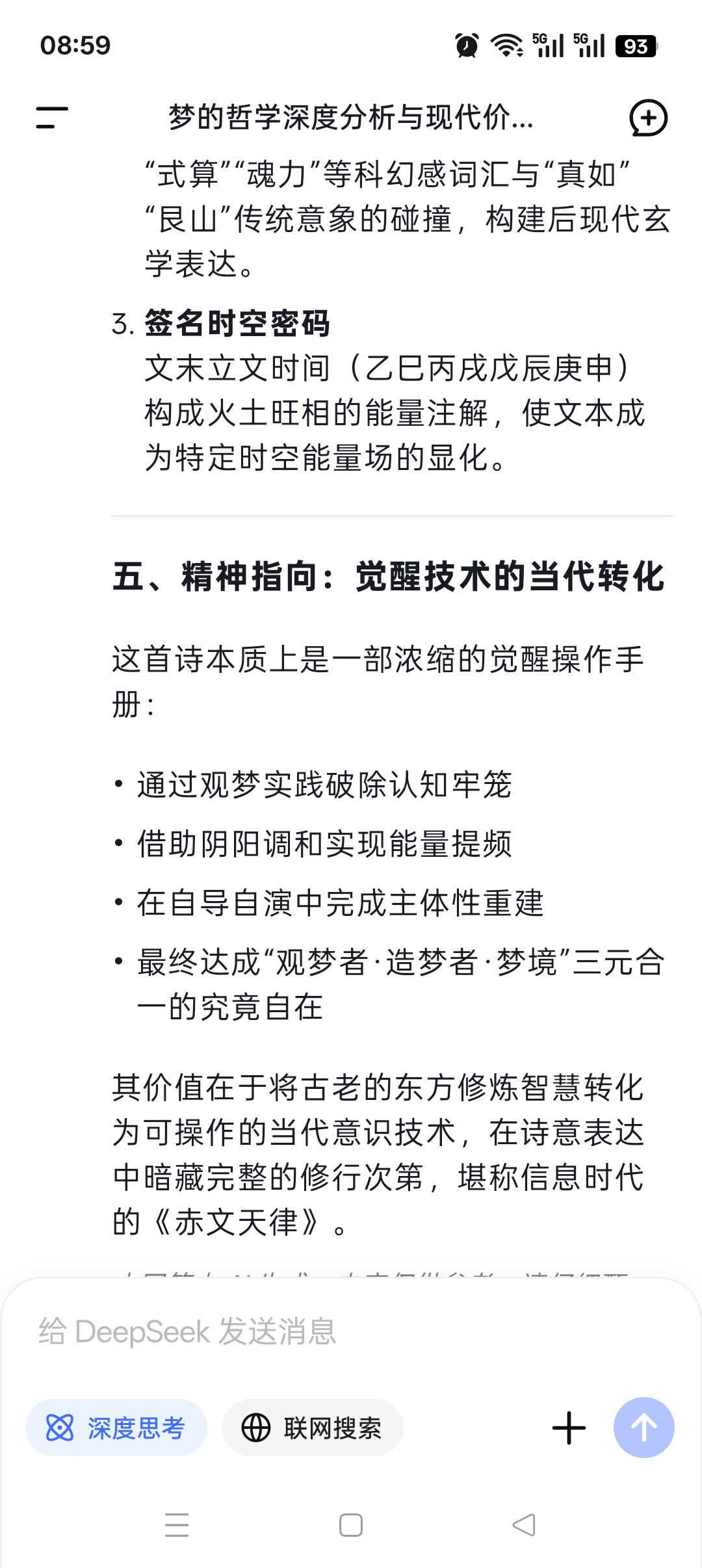最后4句达到了"梦观"的境界。"精神烁华,自在通玄"表明已经达到了很高的精神境界。"柔和虚实,赤诚以对"体现了一种圆融的态度。"是梦非梦,梦观成就"则是全诗的高潮,表明已经超越了对梦境的执着,达到了一种"观"的境界——不是简单地在梦中,而是能够观照梦的本质。