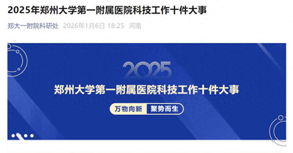 1月6日,郑州大学第一附属医院科研处发布2025年医院科技工作十件大事。