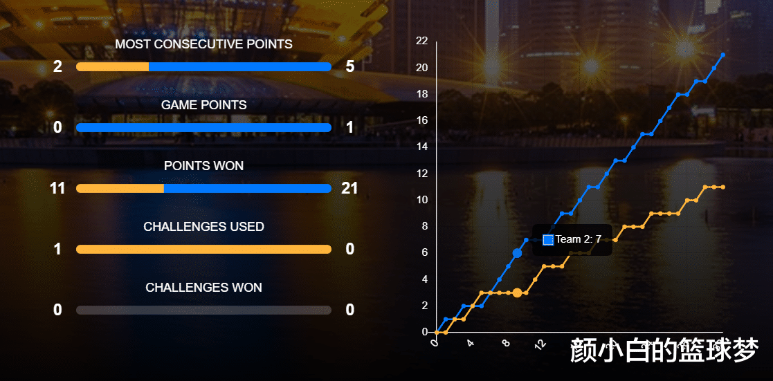 这场比赛第一局开场,两人1-1打到3-3,随后石宇奇就开始发力了直接7-3拉开差距,随后11-6继续维持领先优势,石宇奇13-7领先周天成6分后这一局的局势已经完全被石头掌控,最终石宇奇21-11轻松拿下。