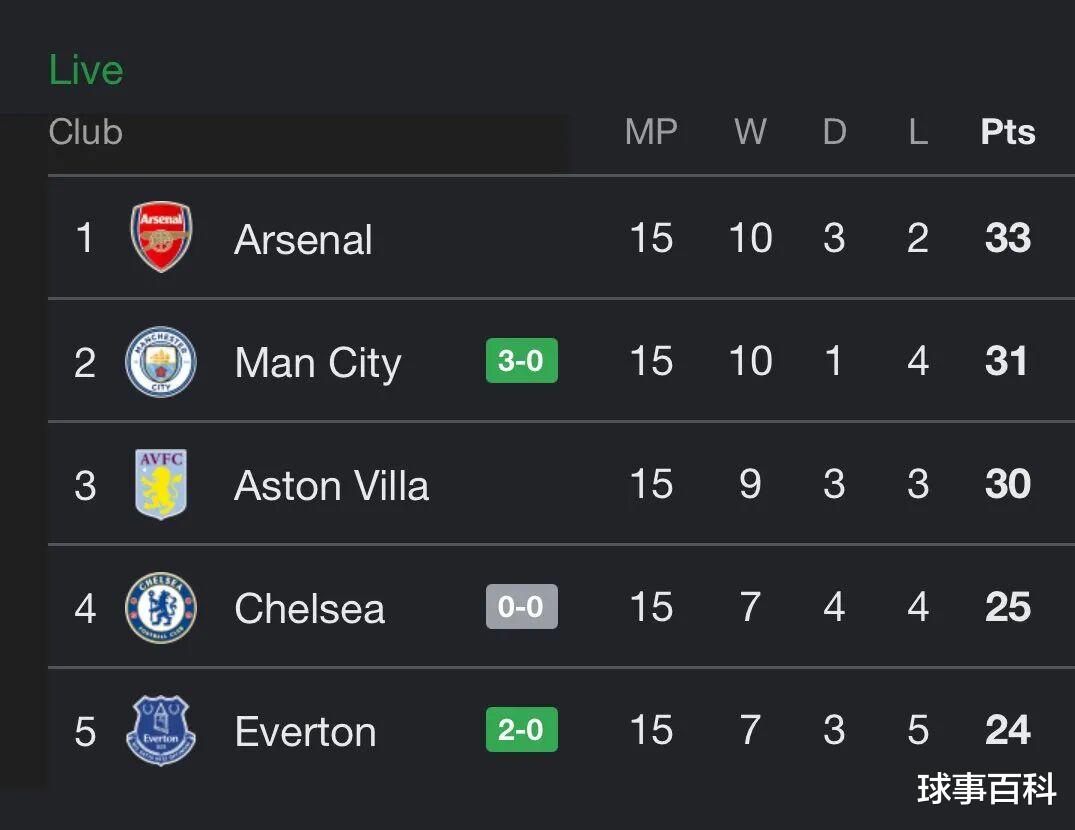 英超15轮过后,联赛的争冠格局发生巨变。在今晚进行的英超比赛中,领头羊阿森纳1-2惨遭维拉绝杀,曼城则3-0轻取桑德兰。在积分榜上,近3轮仅1胜的阿森纳以33分领跑英超。曼城三连胜积31分稳居第2,埃梅里执教的维拉一波五连胜拿到30分排名第3。临近圣诞快车赛程,阿森纳的领先优势仅剩2分,而排名前3的球队仅3分差距,他们也形成了本赛季的英超争冠集团。