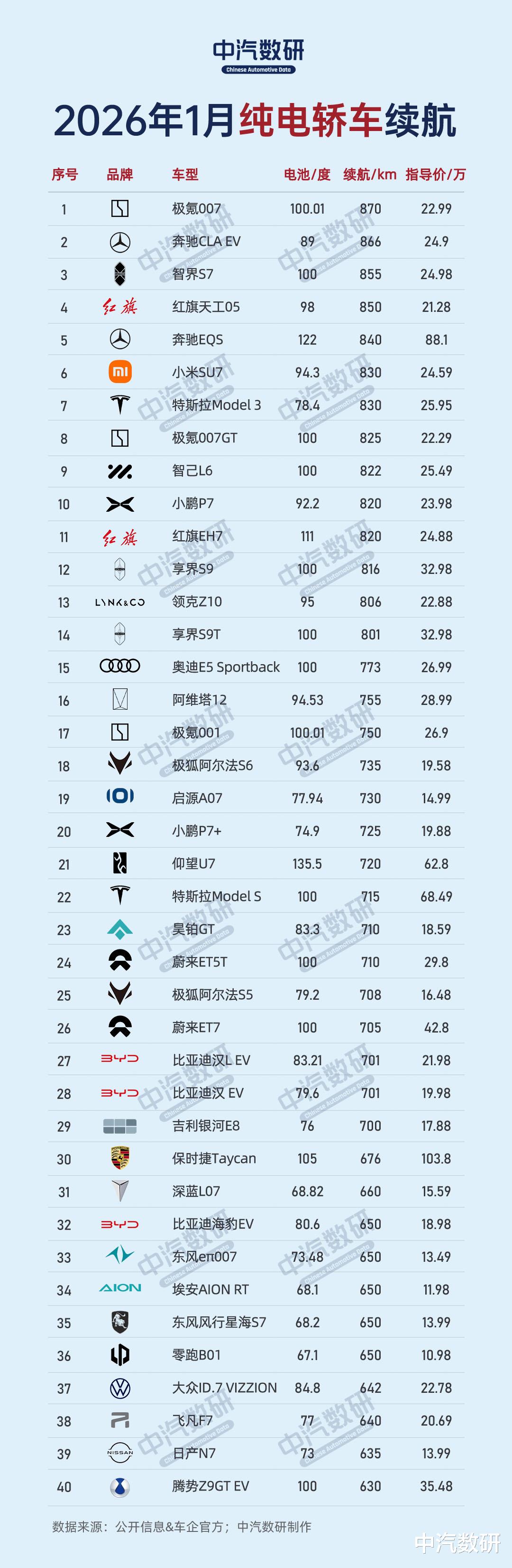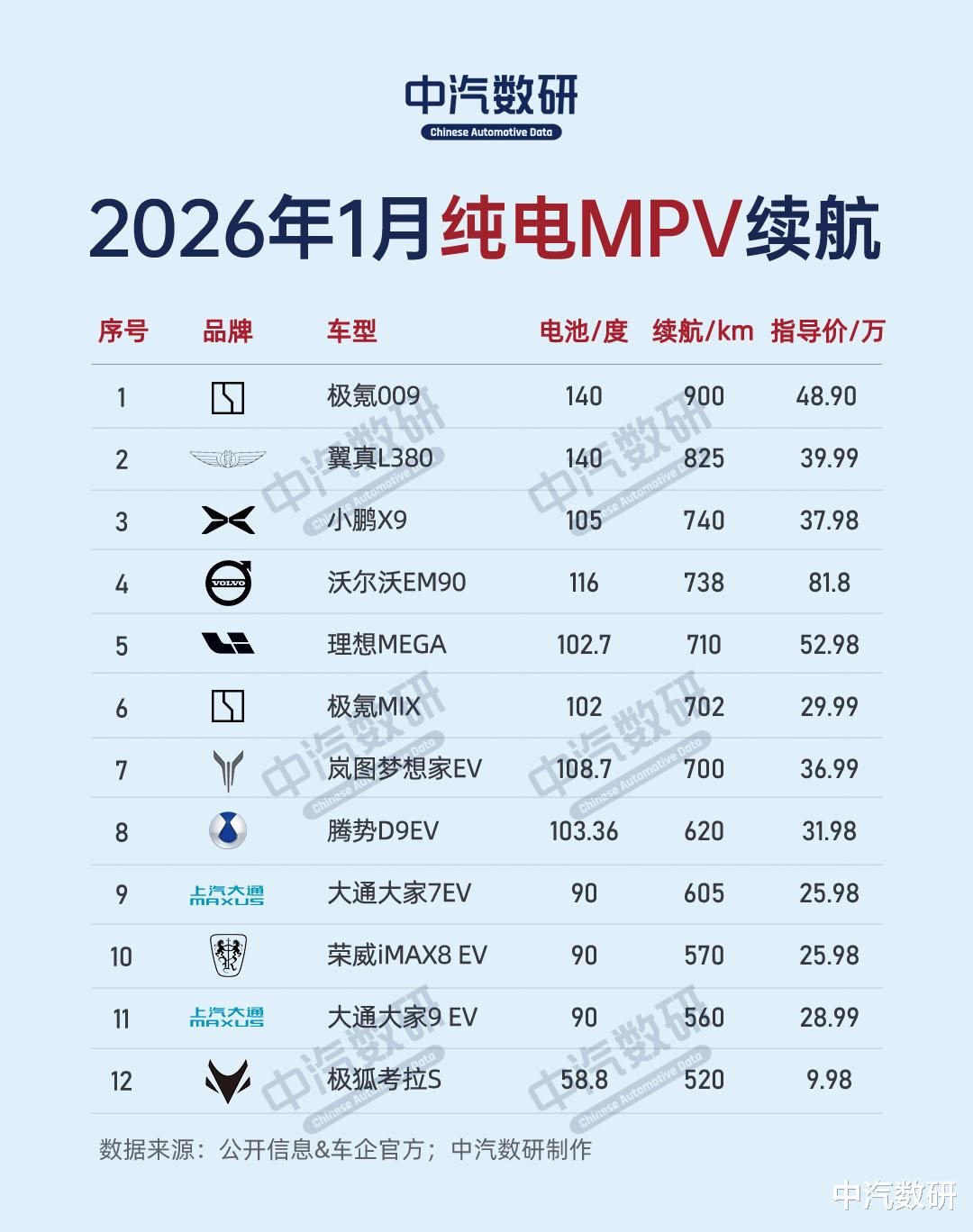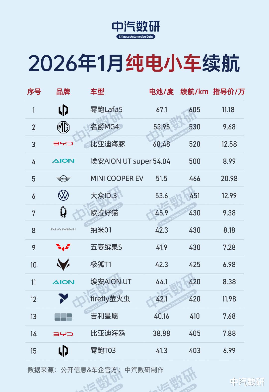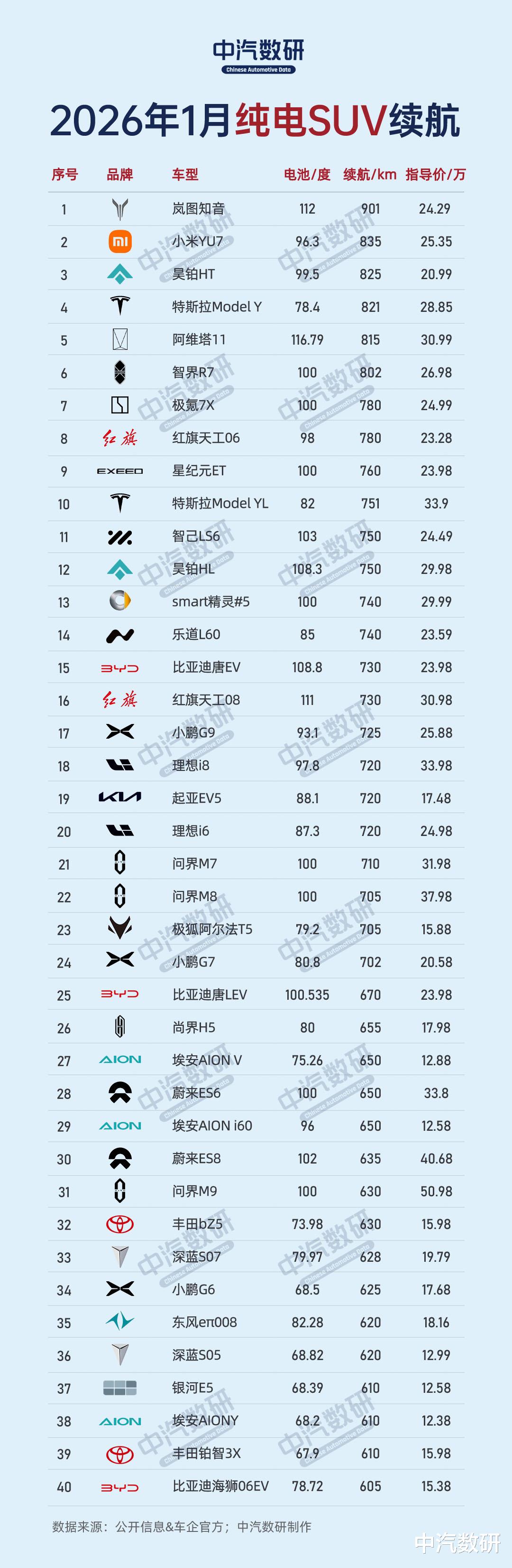 注:每种车型选取续航版本最长的车型,数据更新至2026年1月