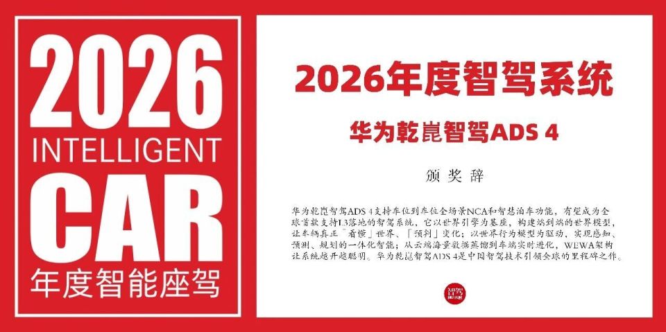 经专家评测团的入围、线下评测和综合品鉴三个环节,本届评选的13个车型奖项、10个科技奖项及最终大奖——「2026年度智能座驾」正式揭晓。