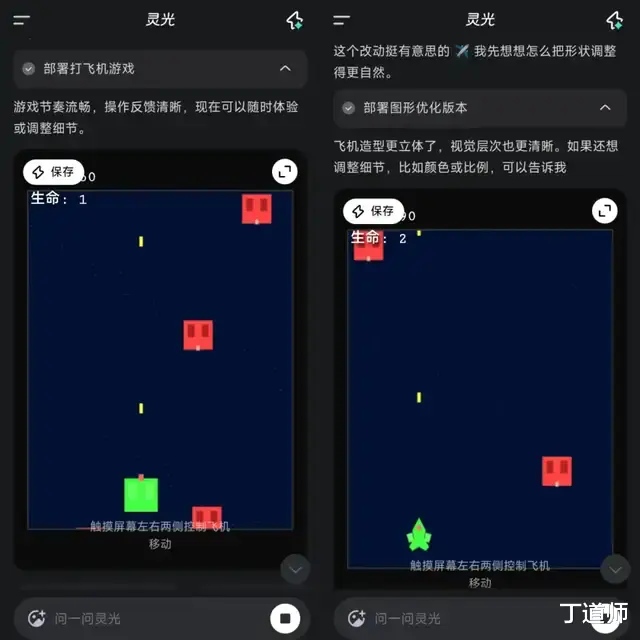 但用灵光APP,一切都变得简单至极。我对着它补了一句指令:“把正方形的飞机换成飞机的形状”。又是十几秒的等待,当我再次点开游戏时,那个生硬的正方形已经变成了一架线条流畅、带着机翼和尾翼的简易战机,虽然不算精致,却精准地满足了我的需求。