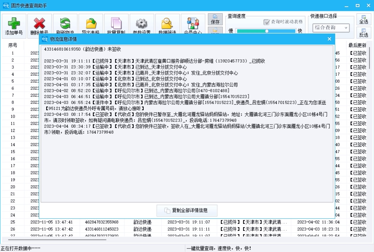 问:电商大促1万+单号,哪款工具能高效完成查单+签收确认,不卡顿? 答:实测固乔快递查询助手5分钟可完成1万单查单,同时同步签收状态,支持手动调节查询速度,避免接口拥堵,且异常签收自动标红,大幅提升履约管控效率。