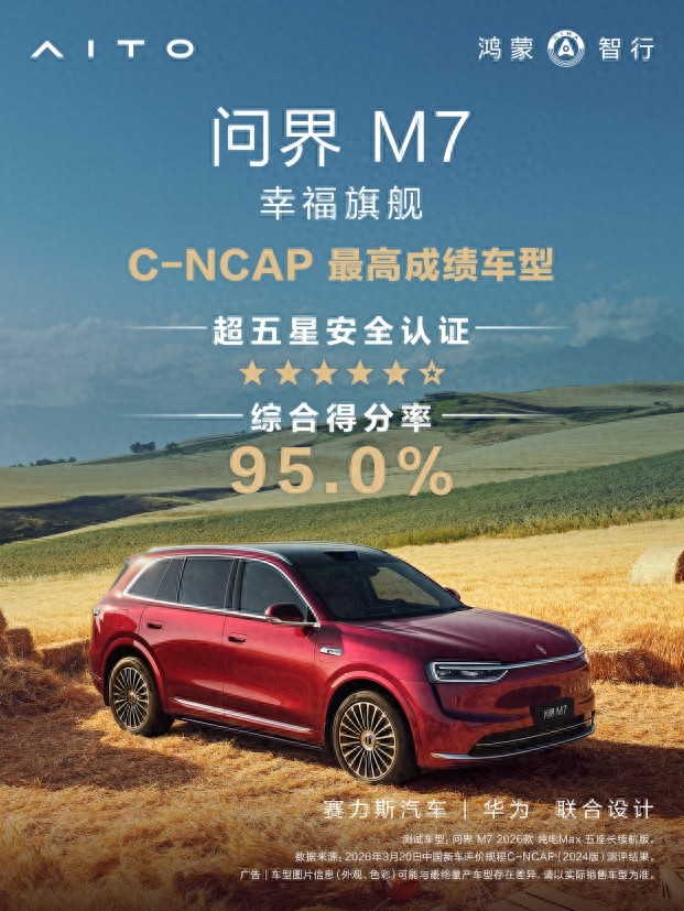 3月20日,中汽中心汽车测评管理中心的一纸结果,让“国民SUV幸福旗舰”问界M7站上了新的巅峰:它以95%的综合得分率,一举刷新C-NCAP(2024版)最高分纪录,荣获“超五星安全认证”。这个成绩,不只是对一款车安全实力的肯定,更是对问界品牌“安全是最大的豪华”这一理念的最佳注脚。