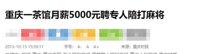 3、原文刊登于重庆时报2013-10-15发布的关于《重庆一茶馆月薪5000元聘专人陪打麻将》的报道;