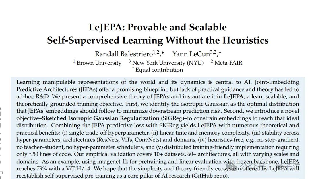 LeJEPA核心提出了一种基于各向同性高斯嵌入的自监督学习方法,通过引入SIGReg正则化,有效解决了表示崩溃问题,并显著提升了模型的泛化能力。