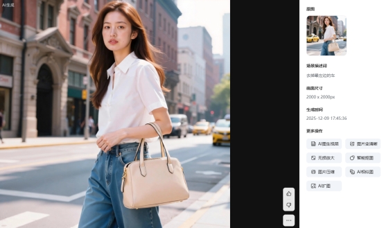 在基础编辑层面,易可图支持裁剪、旋转、尺寸调整、亮度和对比度修改、文字添加等常见操作。对于只需要做简单调整的新手来说,不用依赖复杂的软件,也能快速完成一张可用的图片。如果在基础编辑之后还希望进一步优化效果,可以直接切换到 AI 万能改图,对原图进行更深度的画面调整。