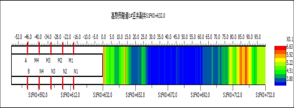 通过CFC偏移成像,获得掌子面前方100m围岩含水结构分布(图2)。图像中: