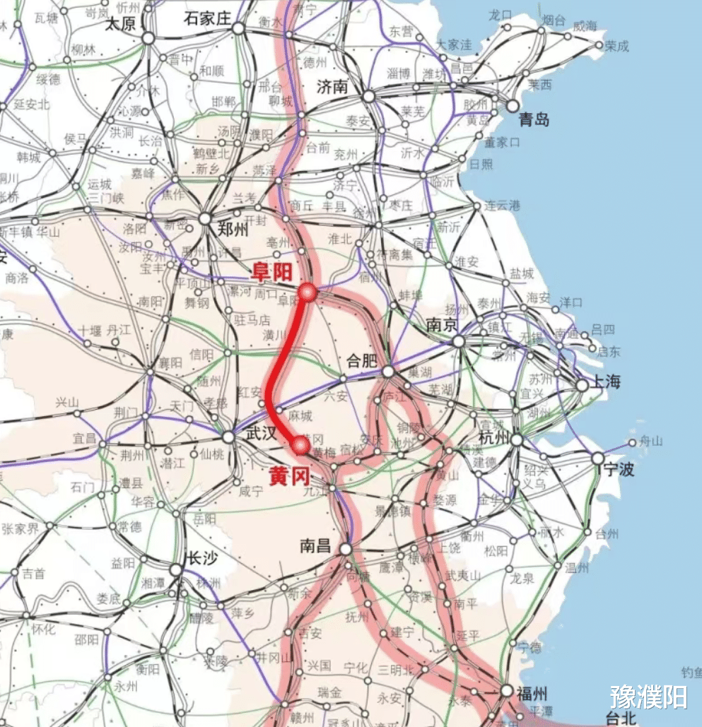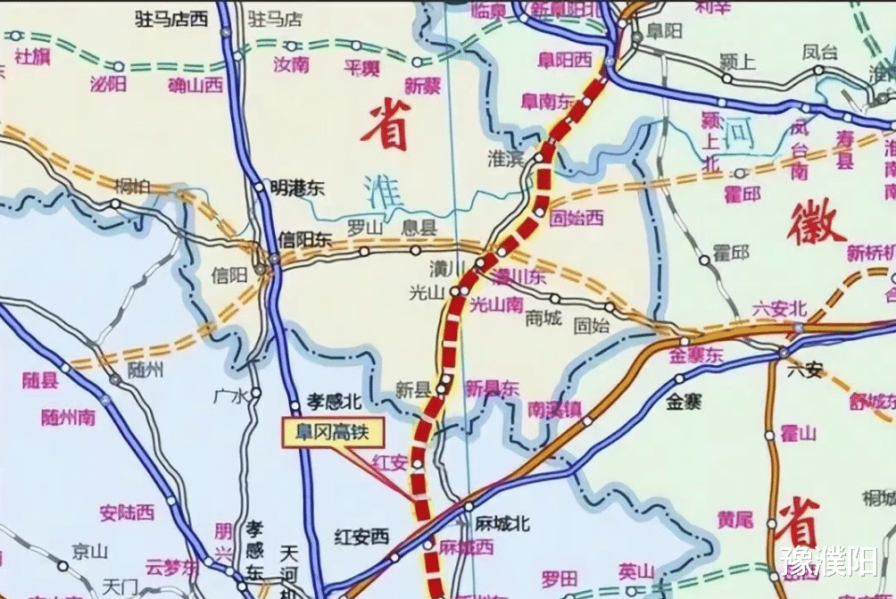线路北端在阜阳枢纽衔接既有商合杭高铁、郑阜高铁及在建阜淮城际铁路,中段与规划南信合铁路、在建合武高铁相交,南端接入既有黄黄高铁,建成后将彻底打通京港高铁中段的通行瓶颈,让南北高铁主通道实现高效贯通。