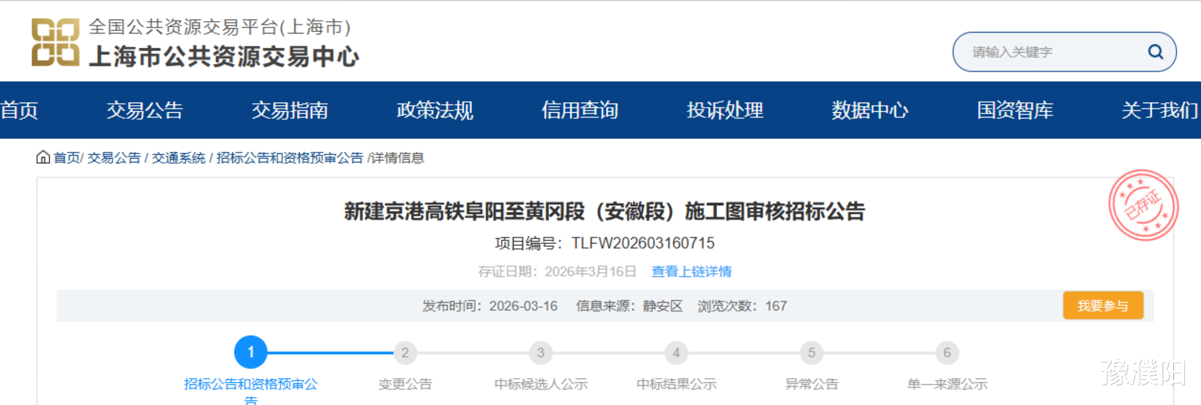 3月16日,新建京港高铁阜阳至黄冈段(安徽段)施工图审核招标公告发布,标志着阜阳至黄冈高铁安徽段将率先进入施工图审核阶段,施工图蓝图即将落地,批复后即具备施工招标条件,阜黄高铁年内开工已“板上钉钉”。