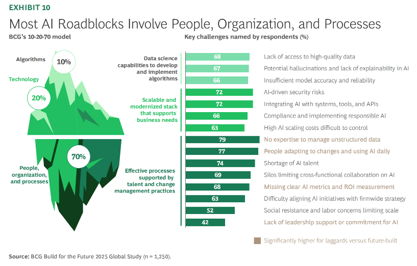 它们将整体业务目标转化为一个多年期、资金充足的AI愿景,并配有明确的执行路线图。它们任命首席AI官和首席数据官,不是为了设岗,而是为了自上而下地破除结构性障碍。