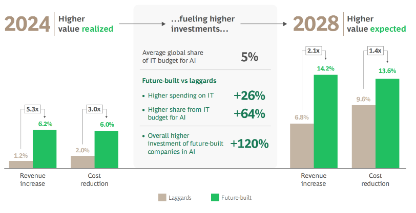 这并非静态的差距。报告指出,未来构建型企业计划在2025年将IT预算的64%投入AI,比滞后型企业高出近26%。这种更激进的投资,预计将为它们带来2倍于滞后者的收入增长和1.4倍的成本削减。