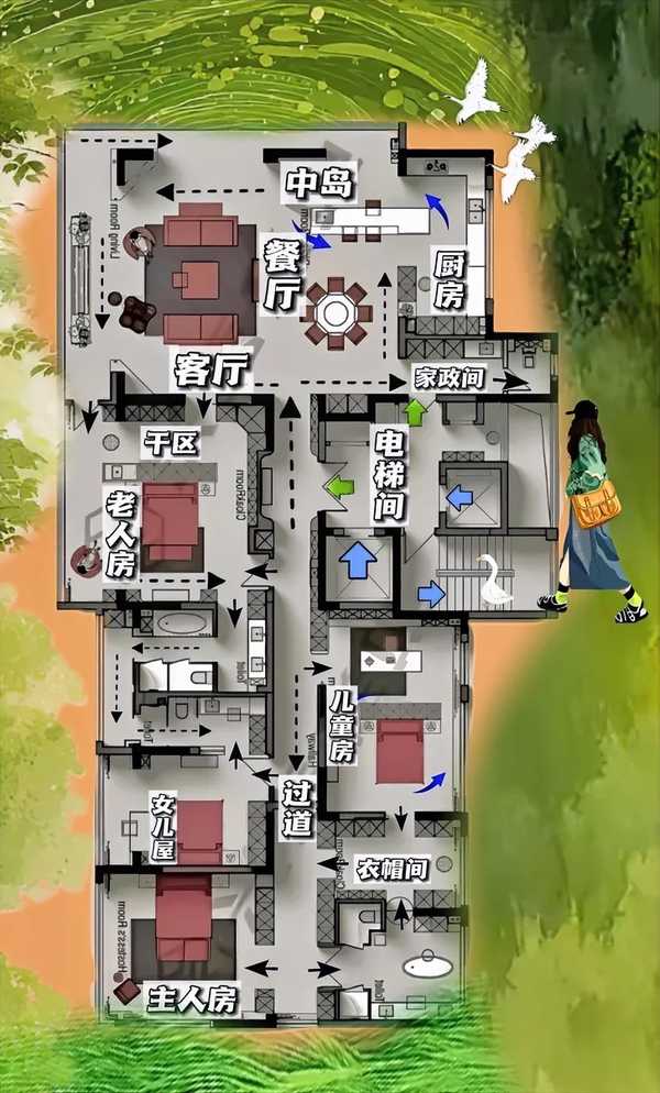 她真的是一个有趣的灵魂,趣味感满分,371㎡是藏在不住的灵秀,尤数四间卧室,接曲式动线走,就是两个大套房!
