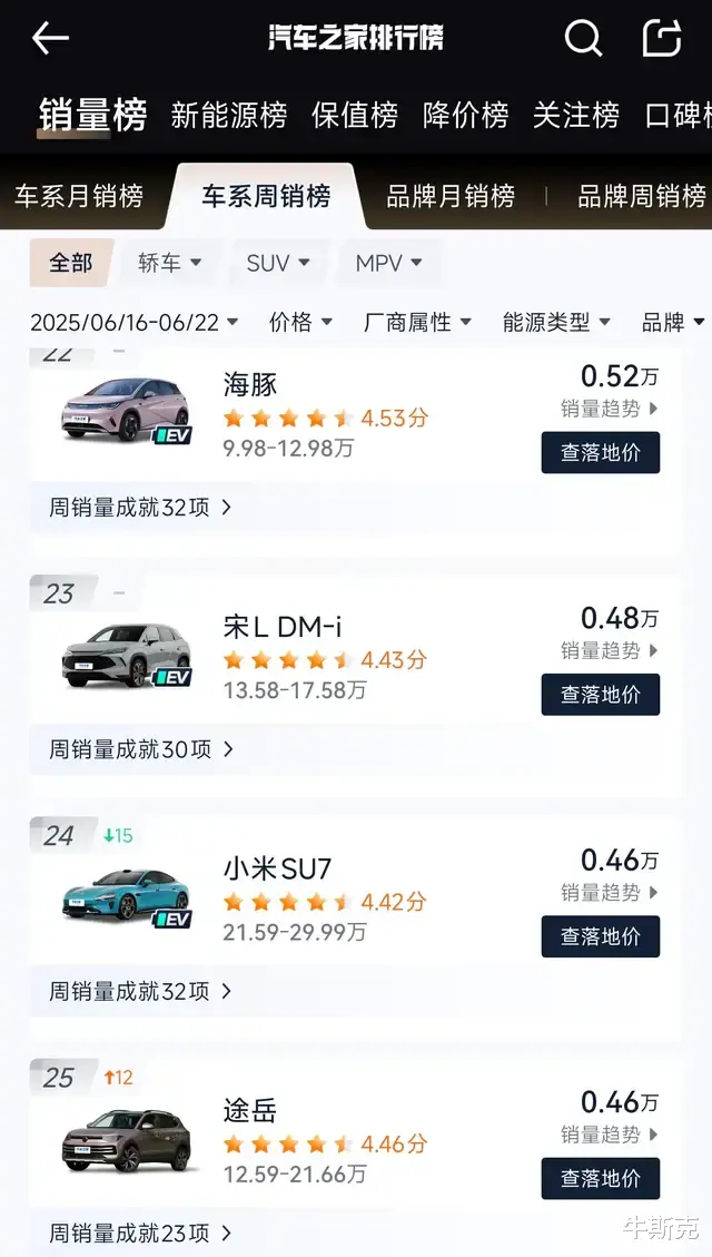 而伴随着YU7幸福的销量,也有随之而来的烦恼。这个烦恼也是来源于另一款小米汽车,就是小米首款汽车SU7。通过销量榜单,我们可以看到小米su7上周在卖出了4.6K辆,这个数字对比其他车商相当不错,但小米SU7在销量榜单上下滑了整整15名!这是相当恐怖的,此前su7一直保持持续上升的销量,即便之前的事件也没有影响到小米su7的销量,这次单周下滑15名确实让人意外。