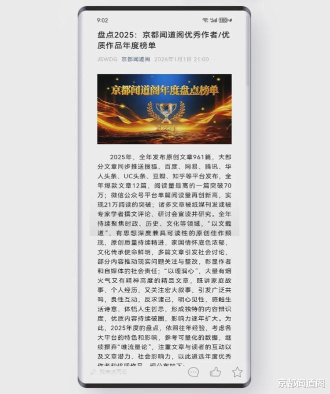 “京都闻道阁”编辑在年度总结中有这样一段话:“全年持续聚焦时政、历史、文化等领域,以文载道:有思想深度兼具可读性的原创佳作频现,原创质量持续精进,家国情怀底色浓郁,文化传承使命鲜明,多篇文章引发社会讨论,部分内容推动现实问题关注与整改,彰显作者和自媒体的社会责任;以理润心:大量有烟火气又有精神高度的精品文章,既讲家庭故事、个人经历,又关注宏大叙事,引发广泛共鸣,良性互动,反求诸己,明心见性,感触生活诗意,体悟人生哲思,形成独特的内容辨识度,优质内容持续破圈,影响力逐年扩大。”这段话,总结得很全面,很到位。