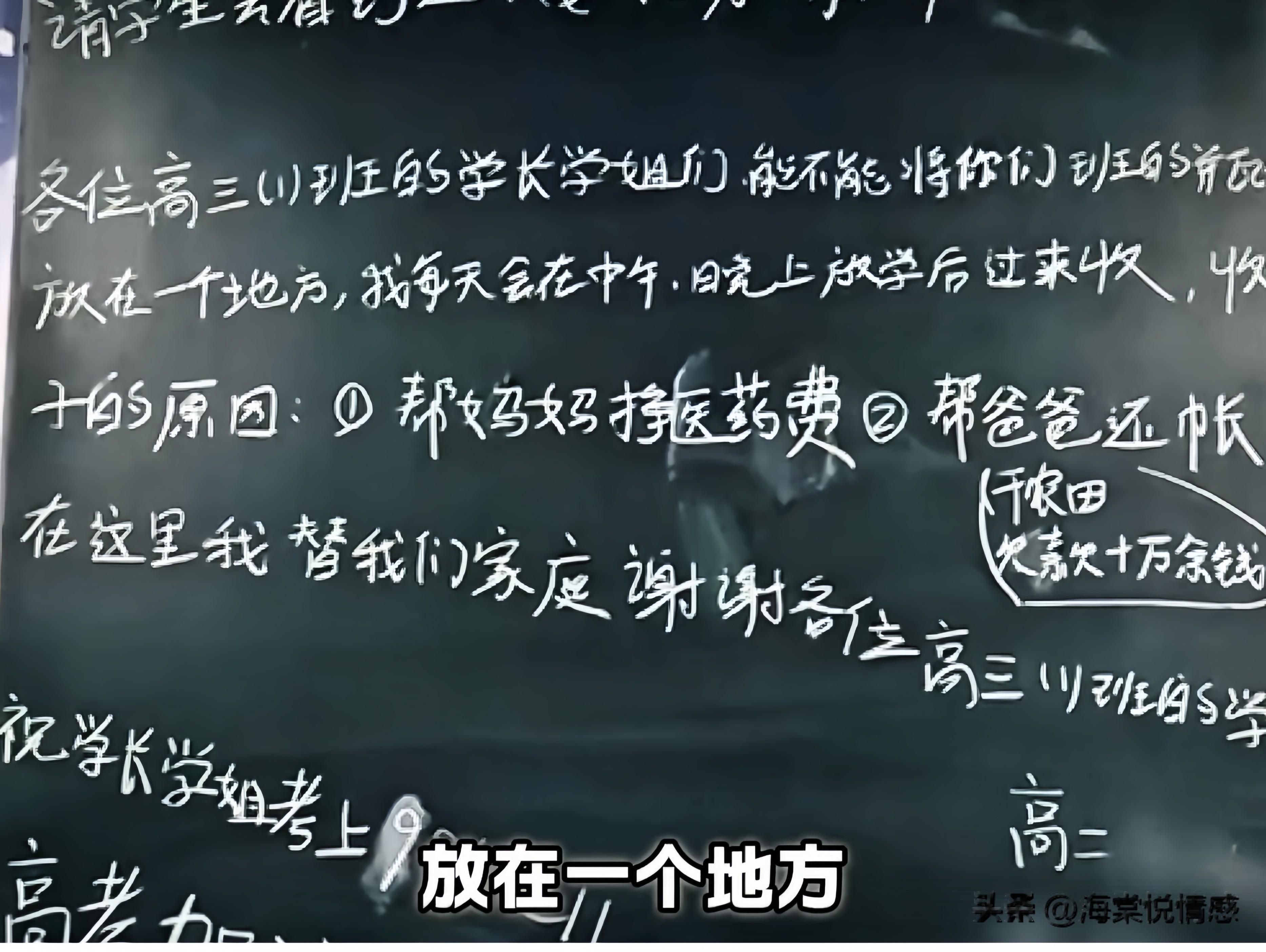 “请学生会看到不要扣分,谢谢!各位高三一班的学长学姐们,能不能请你们把班的瓶子集中放在一个地方,我每天中午晚上放学后会过来收。收集瓶子的原因:1. 帮妈妈挣医药费;2. 帮爸爸还账(干农甜欠款欠了十万余钱)。在这里我替我们家庭谢谢各位高三一班的学长学姐,祝学长学姐们考上985、211,高考加油!麻烦各位学长学姐向其他班级告知,谢谢!”