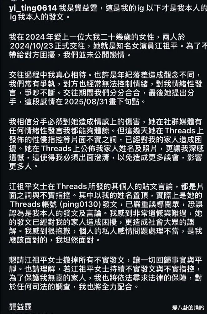 面对江祖平的指控,龚某某迅速发文回应,称两人曾有过交往,坚决否认性侵指控。其父亲也发声,表示 “司法会还他清白”。但随着事件的不断发酵,舆论的天平逐渐向江祖平倾斜。士林地检署迅速分案展开调查,并通知江祖平前往制作笔录。江祖平更是坚定地表示,会带着能让龚益霆坐牢的关键证据前往,不管是刑事还是民事诉讼,都要让真相大白于天下 。