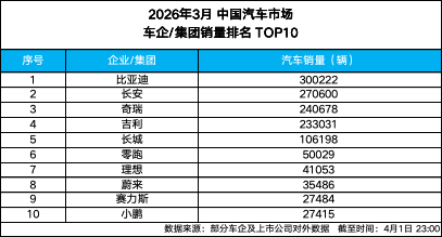 4 月 1 日,比亚迪 2026 年 3 月销量数据出炉,单月狂卖 300222 辆,直接登顶中国车企销量榜首。