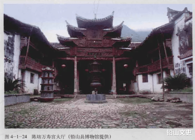 陈坊万寿宫位于铅山县陈坊乡陈坊上街。这里地处武夷山脉北麓,紧贴省界,南行7公里山路即进入福建省光泽县。向北是一条开阔的山谷,其余三面皆是崇山峻岭,满山毛竹无边无际。数十里的山间数百个大小村落,星星点点,与自然环境共生。