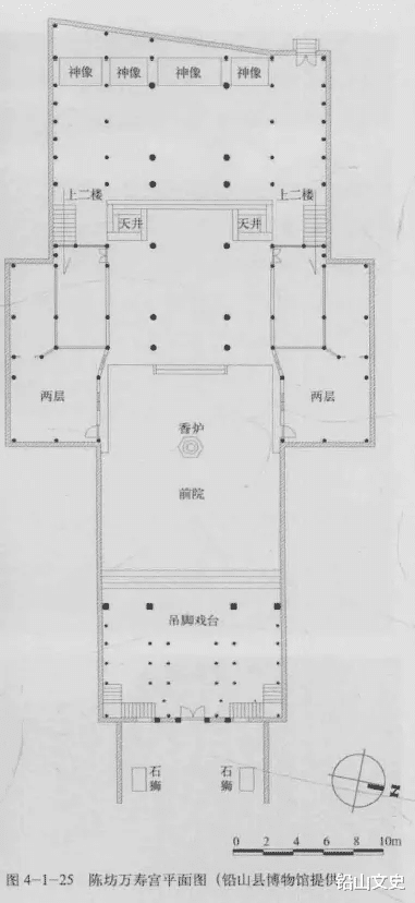 万寿宫前有牌楼式大门,三间四柱三滴水,红石柱,粉壁填充,雕刻丰富,“万寿宫”竖额两侧为透雕双龙抱柱饰带(图4-1-22)。内分前后三进。