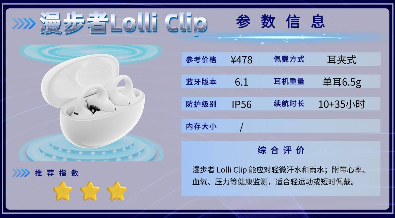 Lolli Clip适合日常通勤和轻运动场景,主动降噪和开放式佩戴提升舒适感,IP56防护增强了日常抗汗能力。音质和佩戴都中规中矩,不适合高强度运动或水下使用,但短时运动和日常使用体验足够稳妥,轻量化和功能性都比较均衡。