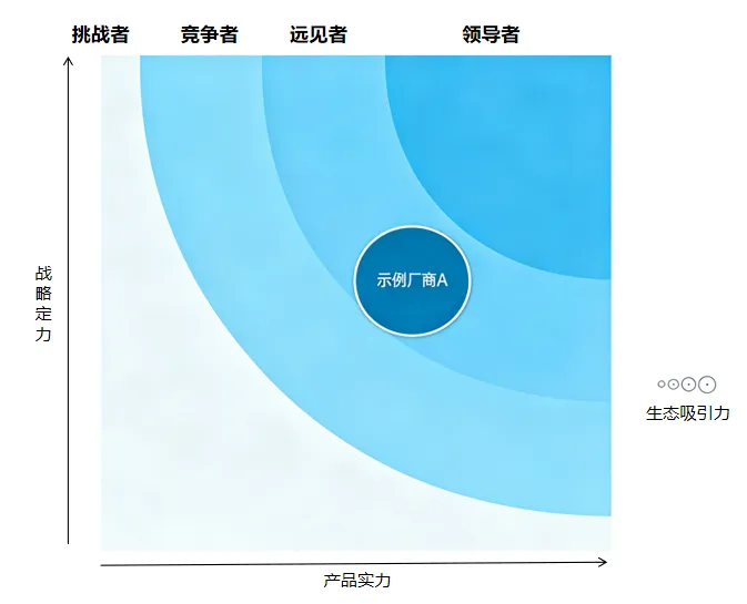 最终,我们不会简单排出123名,而是绘制出"引力象限图":X轴代表企业当前的产品实力,而Y轴则代表企业当前产品战略,圆圈大小则代表生态吸引力。同时引力象限被划分为四个区域——领航者、远见者、竞争者、挑战者。这种二维定位比线性排名更能反映企业的真实处境。