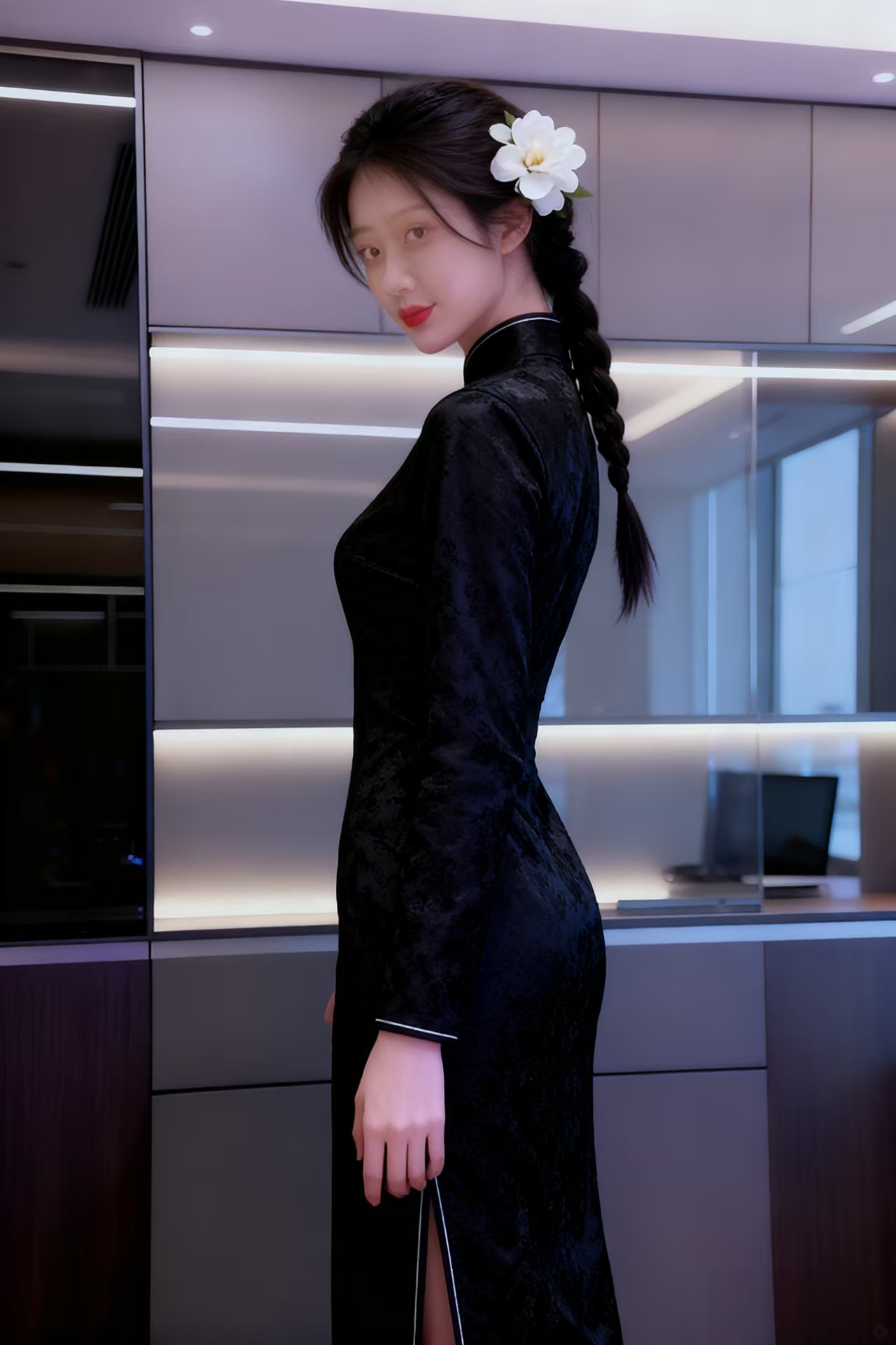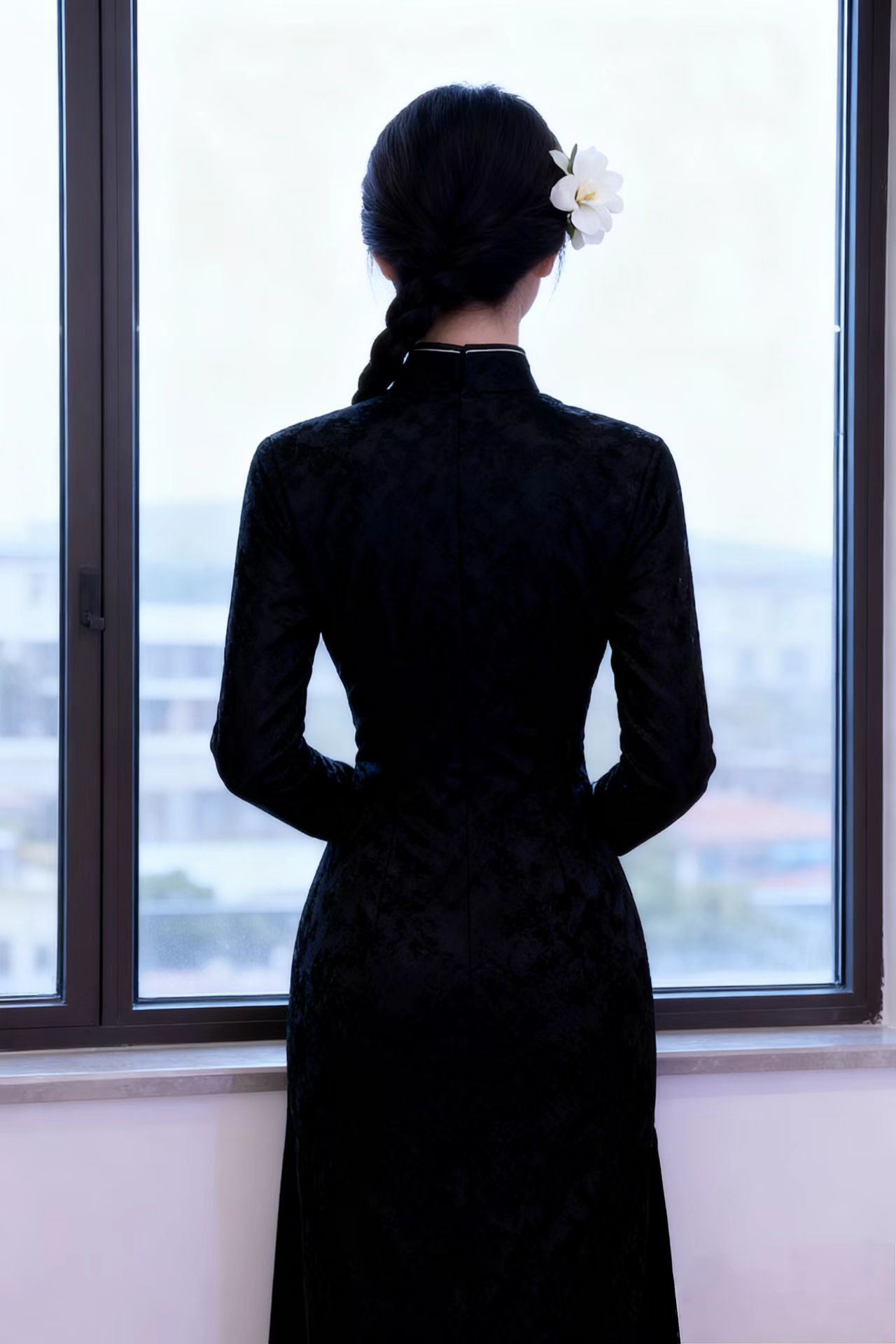 她身着一袭黑色旗袍,面料带有细腻的纹理与暗纹,显得低调而有质感。旗袍为立领设计,领口与衣襟处饰有精致的盘扣,增添了古典韵味。袖口长度到小臂,贴合手臂线条,整体剪裁修身,勾勒出优雅的身姿。