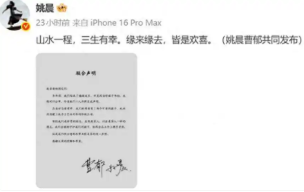 3月16日时,姚晨与曹郁共同发布离婚声明。