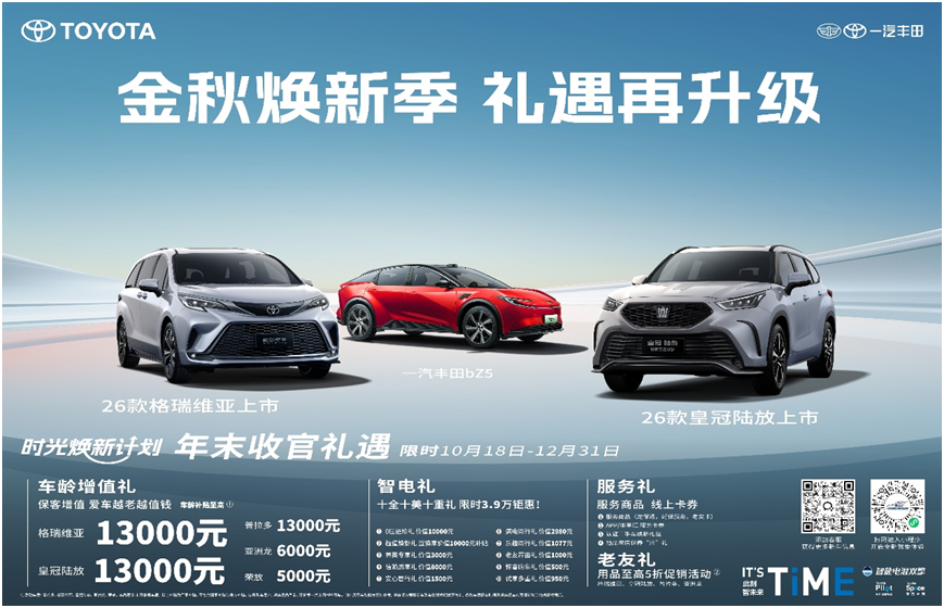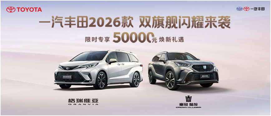 这个金秋,一汽丰田以诚意大礼和两款重磅车型的焕新上市,将先进科技与人文关怀融入到用户生活的每个细节,为用户提供了美好出行的新想象。诚如2026款格瑞维亚的口号,一汽丰田也正与用户,从我们的家到更好的家,一起创造美好,一起驶向更值得期待的新远方。