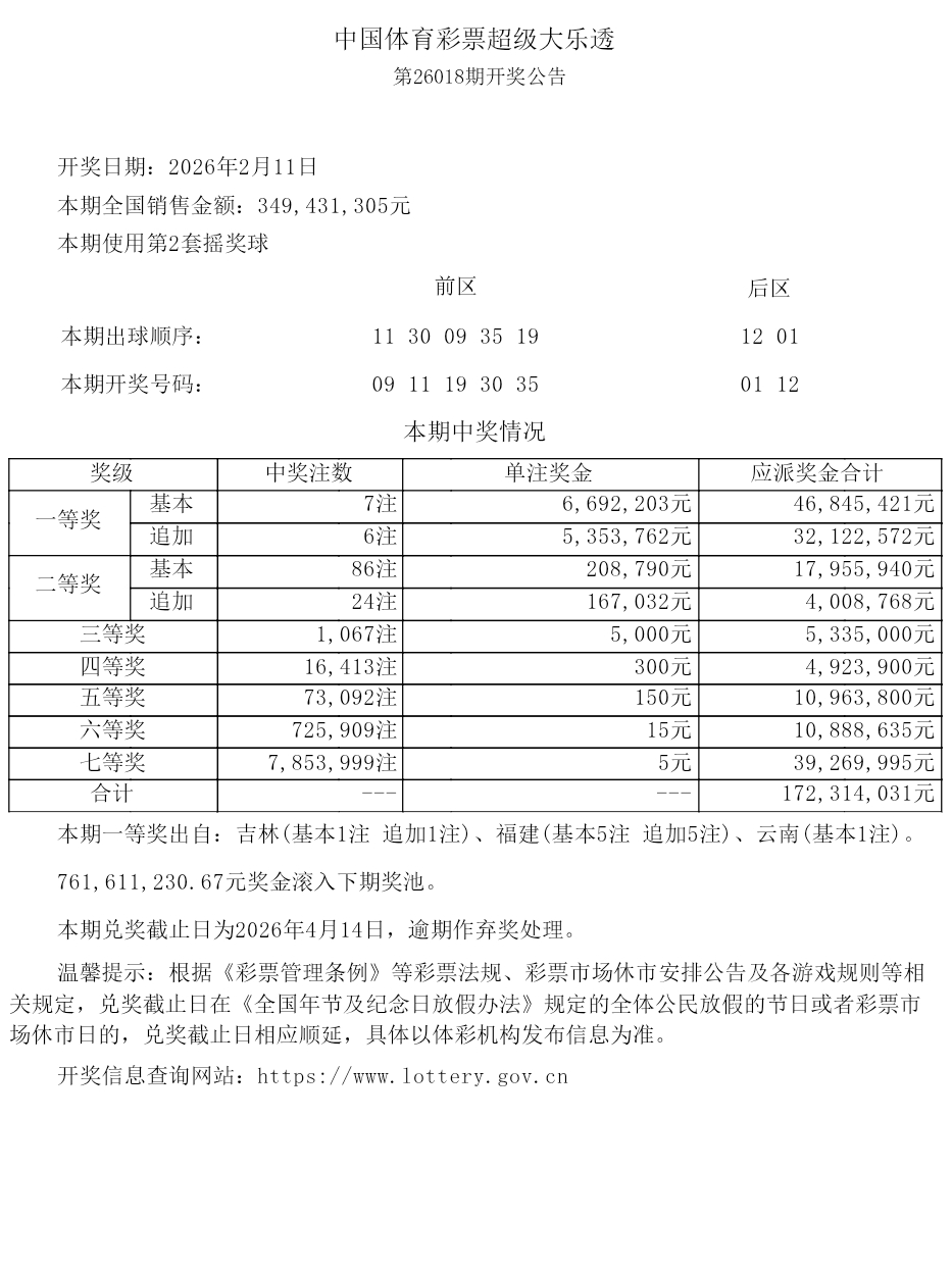 体彩超级大乐透2026018期开奖信息
