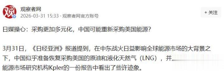 3月31日,《日经亚洲》的一篇报道直接在日本舆论场炸开了锅:中国将恢复大规模采购美国原油与液化天然气(LNG),这是特朗普第二任期以来,中美能源贸易的首次重磅重启。
